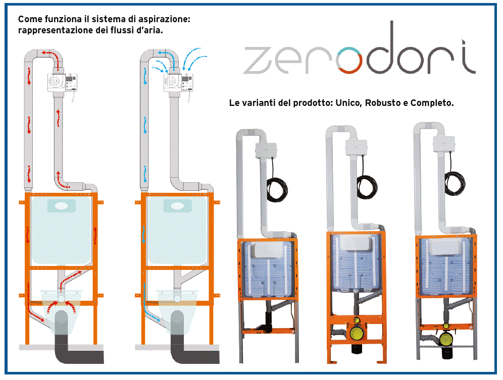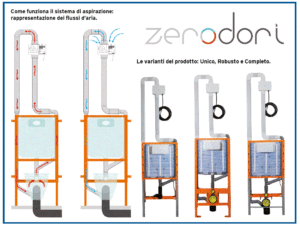 Il sistema Zerodori, proposto da Zero+ Innovazioni, è disponibile in due versioni, una per l’aspirazione solo degli odori definita Zerodori e una per l’aspirazione degli odori e dei vapori in eccesso definita Zerodori Mix.