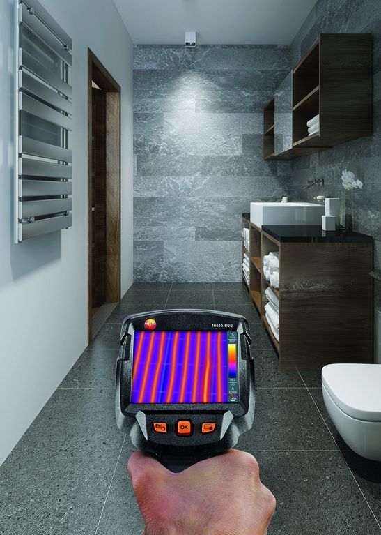 Installatori e manutentori di impianti di riscaldamento vengono spesso chiamati per localizzare e riparare i punti non a tenuta delle tubazioni dell’acqua calda. Se le perdite potenziali si trovano sotto le piastrelle o i pavimenti in calcestruzzo, la ricerca del punto critico comporta un estremo dispendio di tempo e di lavoro, in quanto occorre spesso aprire grandi porzioni di pavimento. Con l’ausilio di una termocamera è possibile individuare subito e con grande praticità i punti non a tenuta, senza dover danneggiare inutilmente i locali abitativi del cliente. La termocamera è uno strumento di diagnosi assolutamente non distruttivo, ideale quindi per la localizzazione di danni, intasamenti o perdite. La termocamera testo 868 offre un’alta qualità delle immagini ed è dotata di una fotocamera digitale integrata con funzioni innovative e smart.