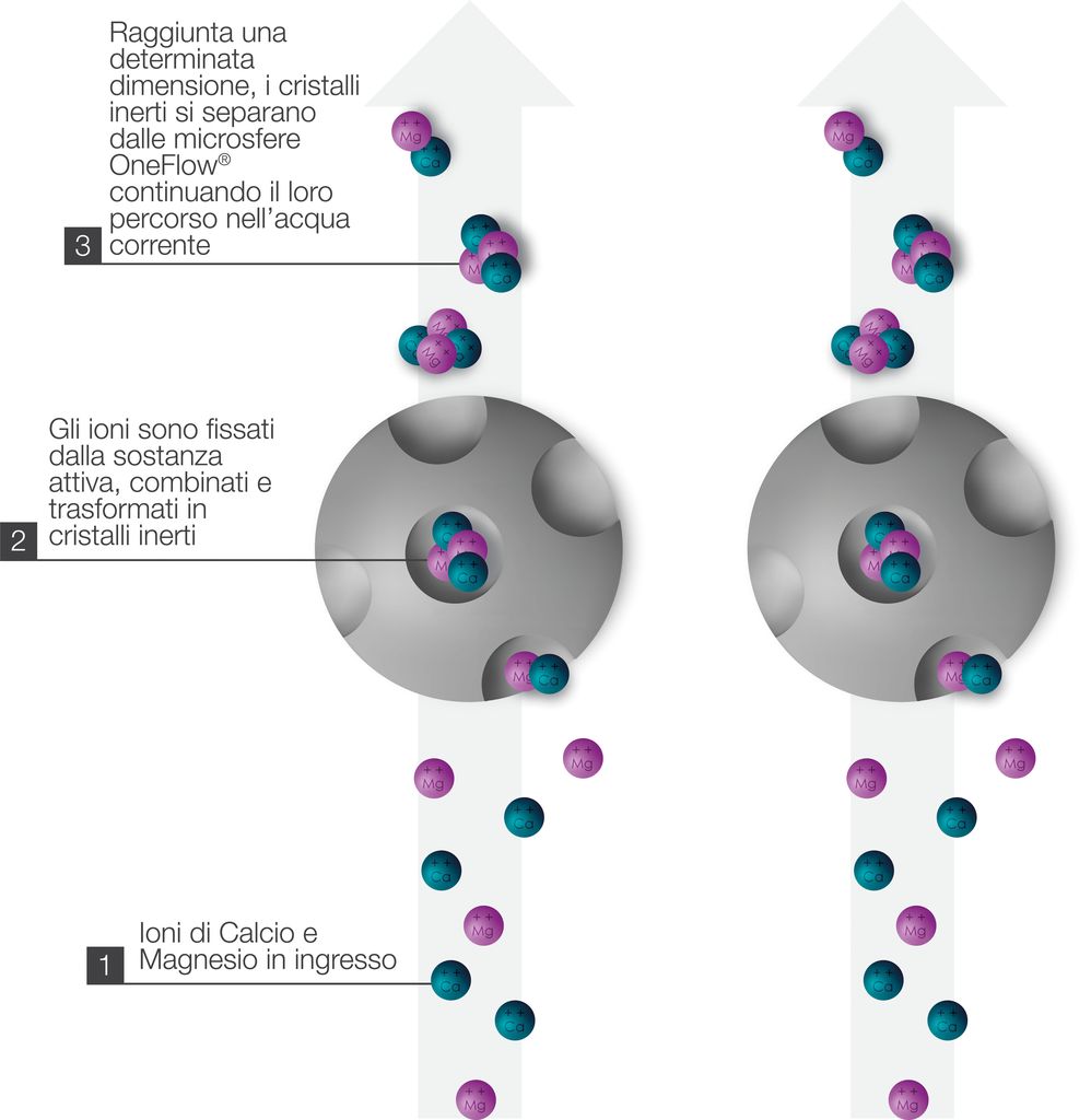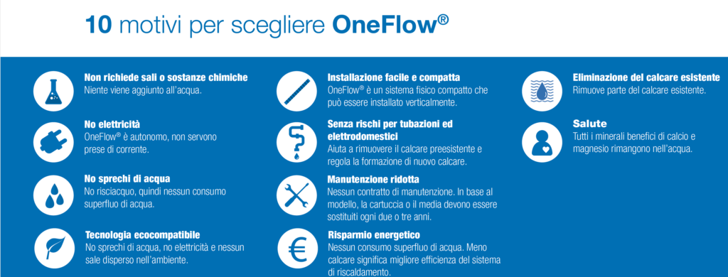 Watts propone il sistema OneFlow che rimuove i depositi di calcare, mantenendone prive sia le tubazioni sia i sistemi e prevenendone la formazione. Il sistema OneFlow previene i depositi di calcare su tubi e rubinetti favorendo una più lunga durata degli elettrodomestici e una migliore efficienza del sistema idrico.
