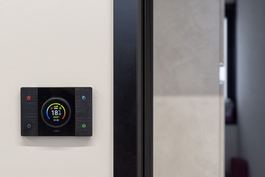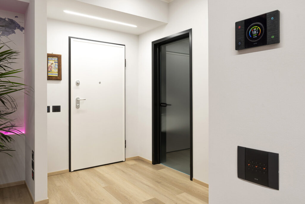 Questo supervisore evoluto consente di gestire da un’unica interfaccia, estremamente intuitiva, tutti i sistemi: domotica, videocitofonia IP, controllo accessi e comfort climatico. Grazie alla sua interazione con i dispositivi AVE, è possibile regolare in modo preciso e programmabile la temperatura degli ambienti, ottimizzando l’efficienza energetica e il benessere quotidiano. A supporto del sistema, è stato installato anche un cronotermostato intelligente AVE, dotato di ghiera rotativa e display a colori, che consente un controllo puntuale del clima interno.
