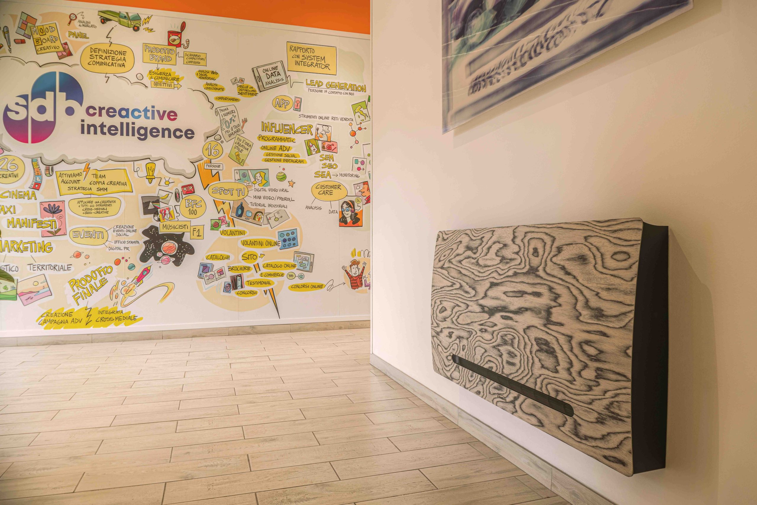 Il primo progetto – WOOD 001 – è stato sviluppato in co-design con il Cliente SDB, agenzia creativa bolognese, alla ricerca di una soluzione che unisse performance tecniche ed estetica di qualità in uno spazio di lavoro creativo, con uno stile che evocasse la natura.