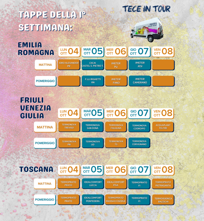 Dal 1 Ottobre 2021 partirà ufficialmente “TECE in Tour”: un evento itinerante che durerà un mese e mezzo, e toccherà più di 140 rivenditori in tutta Italia, con l’obiettivo di presentare il nuovo prodotto a più installatori possibili.