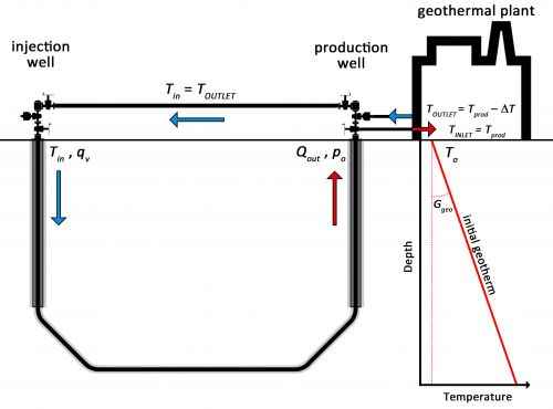 Configurazione del circuito chiuso profondo. Il fluido circola nel circuito artificiale e si scalda scambiando calore con le rocce circostanti la cui temperatura aumenta con la profondità