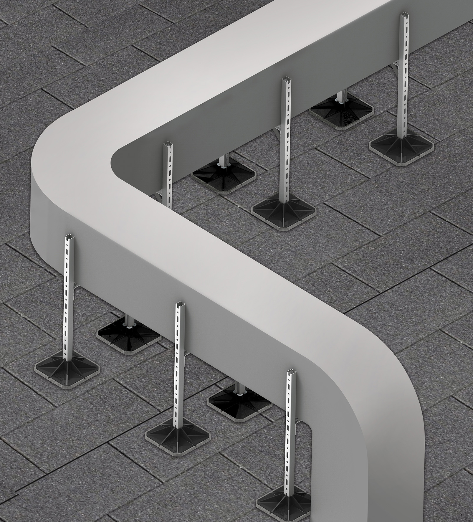 Con la piastra per costruzioni in copertura Big Foot®, disponibile in due diverse dimensioni, MEFA amplia la gamma di accessori destinati al montaggio di tubi, condotte dell’aria e strutture per l’installazione di macchinari su tetti piani. La particolarità della piastra Big Foot® è l’adattatore specifico per l’inserimento dei binari di montaggio della Serie 45, infatti il binario si incastra saldamente quando viene inserito. Questo assicura un’installazione facile e veloce direttamente sul tetto. Se l’adattatore viene rimosso, è possibile installare qualsiasi tubo quadrato con una dimensione di 50 x 50 mm. Con Big Foot® i carichi sono distribuiti su un’ampia superficie di contatto, il che riduce notevolmente il carico di pressione sulla superficie del tetto. Inoltre, uno strato inferiore in EPDM protegge la pellicola del tetto da eventuali danni. Le piastre Big foot hanno una pianta quadrata e lunghezze dei lati di 305 o 450 mm.