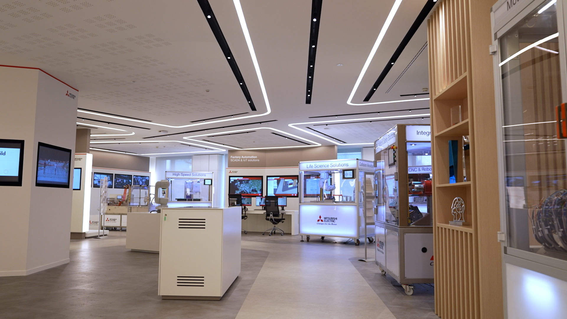 Il piano terra del nuovo edificio è quasi interamente dedicato allo Showroom. Si accede a quest’area passando attraverso un suggestivo portale dove gli ospiti vengono accolti nel “mondo Mitsubishi Electric” grazie alla proiezione di contenuti istituzionali e storici per poi entrare nell’area espositiva altamente moderna e tecnologica in cui poter visionare i prodotti delle diverse aree di competenza: Climatizzazione, Factory Automation, Automotive e Semiconduttori. Un’ampia area è inoltre dedicata a laboratori e training room, in grado di ospitare oltre 80 persone.