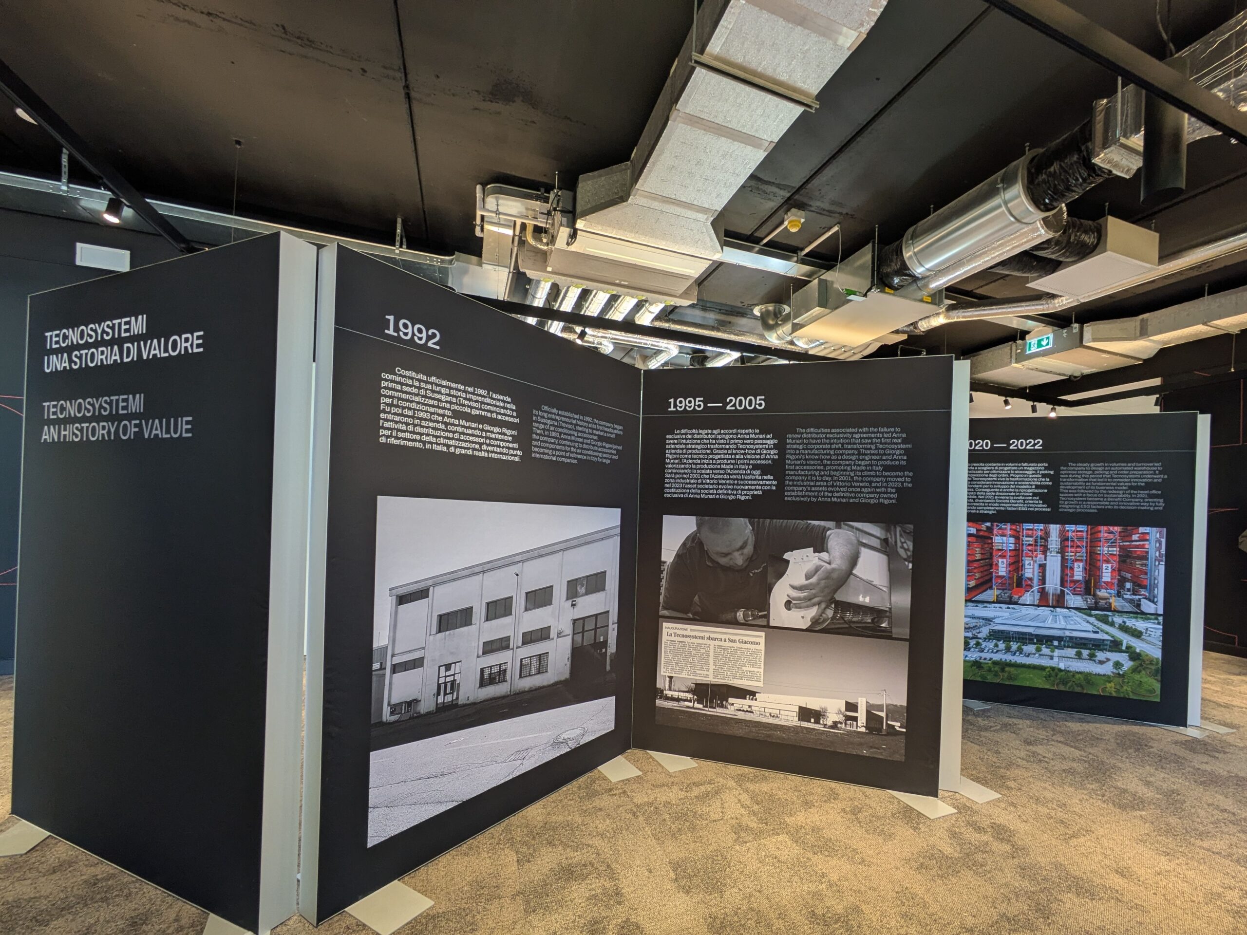 L’area espositiva che introduce il visitatore alla “memoria” dell’azienda è stata realizzata con una timeline narrativa che ripercorre le tappe fondamentali della crescita di Tecnosystemi — dalla fondazione del 1992 alla trasformazione in azienda di produzione nel 1996, fino agli sviluppi infrastrutturali degli ultimi anni; un racconto visivo dei pilastri di sostenibilità che guidano l’impresa e dei valori che ne definiscono la mission e la vision; una sezione dedicata all’evoluzione industriale, rappresentata attraverso disegni tecnici originali di Giorgio Rigoni – Presidente e Direttore Commerciale – che illustrano come dai primi componenti artigianali si sia arrivati all’attuale struttura produttiva avanzata e altamente specializzata.