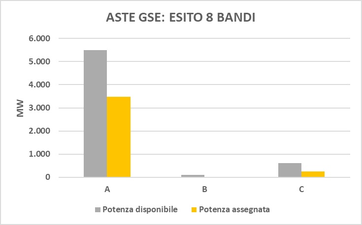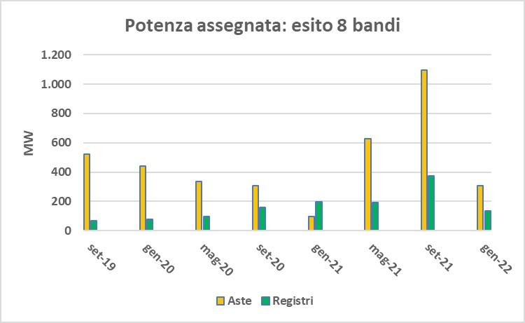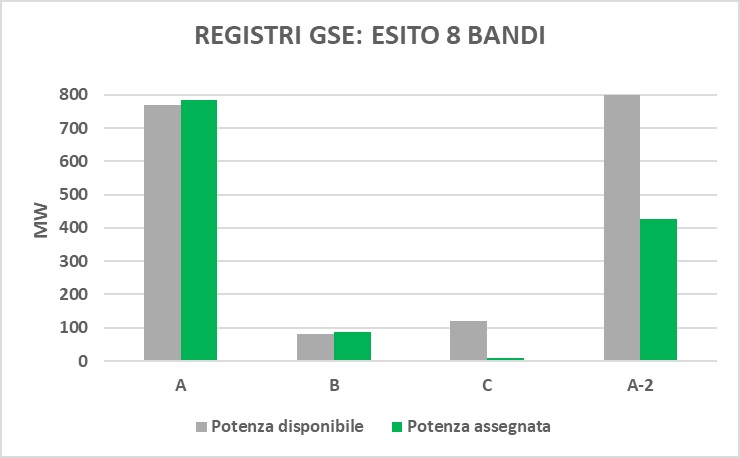 Inoltre, si segnala che, al termine dell’8° bando, per quanto riguarda i registri dei gruppi A e B è stato assegnato tutto il contingente di potenza messo a disposizione, mentre del gruppo C è stato assegnato appena il 7% e del gruppo A-2 circa il 53%.