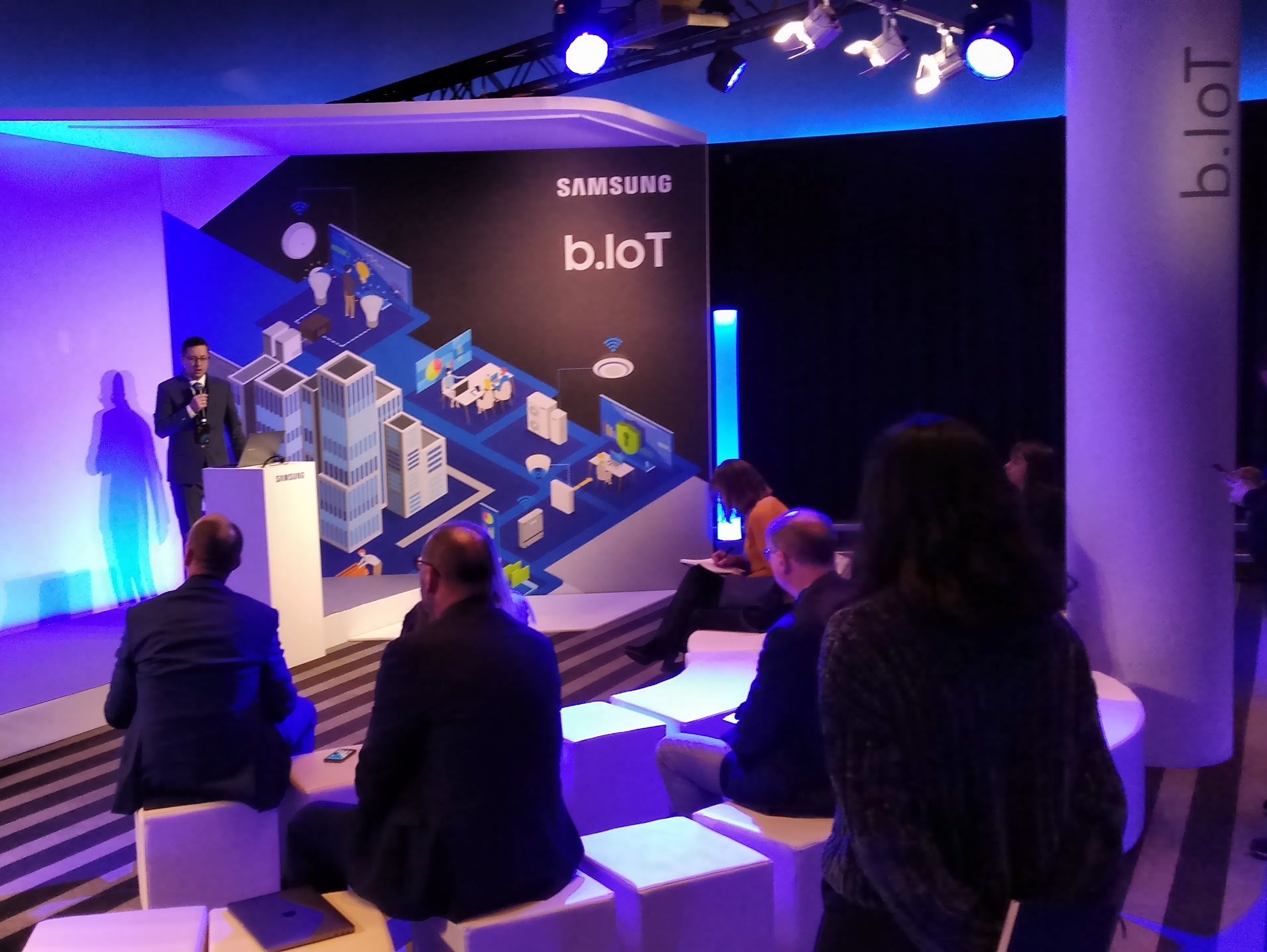 Samsung b.IoT (building Internet of Things), un Building Management System che migliora le prestazioni energetiche e il comfort degli edifici sulla base di algoritmi intelligenti. Presentato da Łukasz Witkowski (IoT Solutions Manager) e Artur Podbielski (Senior Product Manager).