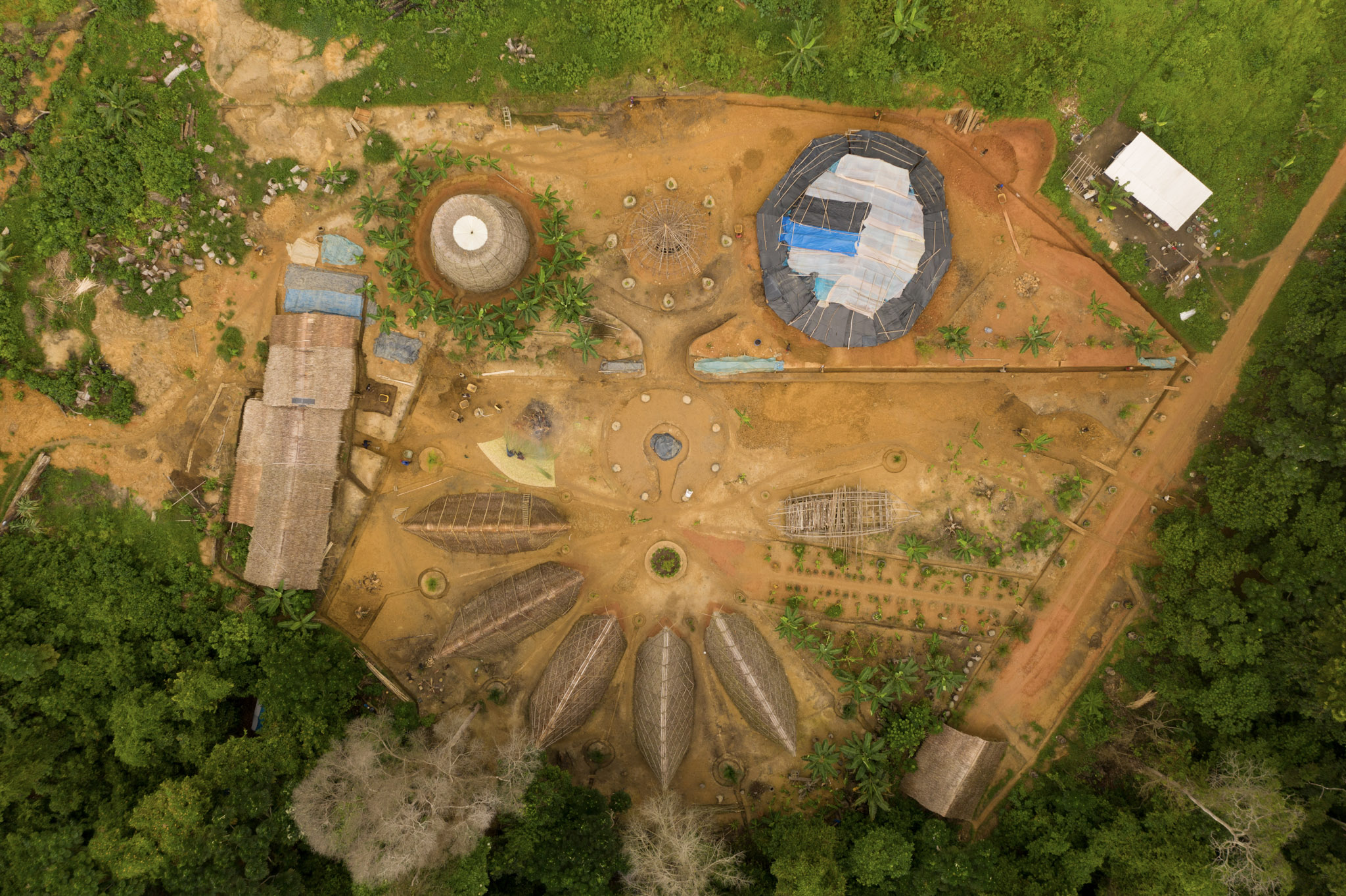 Per la costruzione del villaggio sono state coinvolte quotidianamente oltre 20 persone del luogo: 1 falegname, 7 artigiani per la scelta della paglia e la realizzazione di pannelli in legno, 10 operai per l’installazione dei tetti, per la lavorazione della terra per la ricerca di materiali nella foresta e il loro trasporto. Al team si aggiungono anche 2 persone dedite allo scavo dei canali di drenaggio, 2 signore per la preparazione del cibo, 1 autista e 1 direttore del sito. Un progetto quindi completamente integrato con la comunità, che partecipa attivamente, apprendendo nuovi metodi costruttivi nonché nozioni teoriche importanti per il futuro. In tal senso, la realizzazione delle varie strutture del villaggio non si pone soltanto quale opera sostenibile nell’ottica di materiali e tecniche che rispettino l’identità culturale del luogo, ma assume una funzione di stampo soprattutto sociale, mostrando come l’architettura possa diventare uno strumento di rinascita e cooperazione.