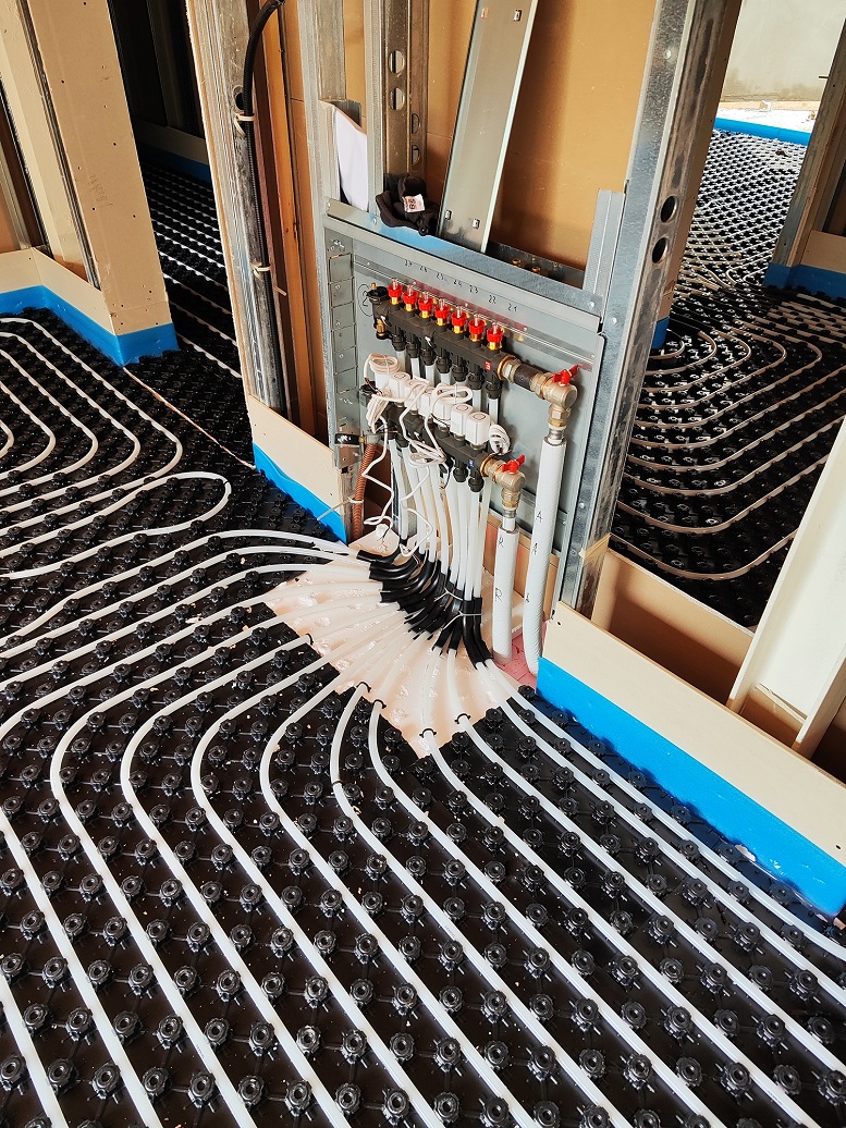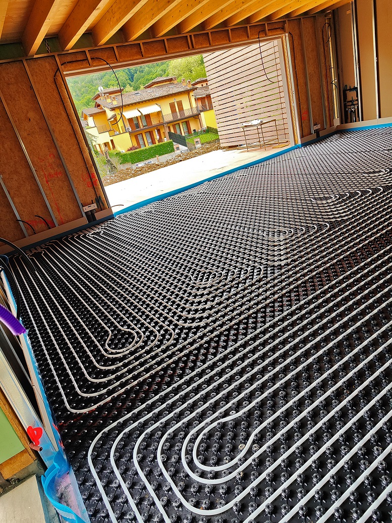 Per l’impianto termico è stato scelto un sistema radiante a pavimento di tipo TF certificato CAM di RDZ, utilizzato sia per il riscaldamento invernale che per il raffrescamento estivo: si tratta di un pannello bugnato in polistirene espanso prodotto in conformità alla normativa UNI EN 13163, rivestito con pellicola termoformata in HIPS spessore 0.6 mm per maggiore resistenza alla deformazione da calpestio e dotato di incastri sui quattro lati per facilitare l’accoppiamento.