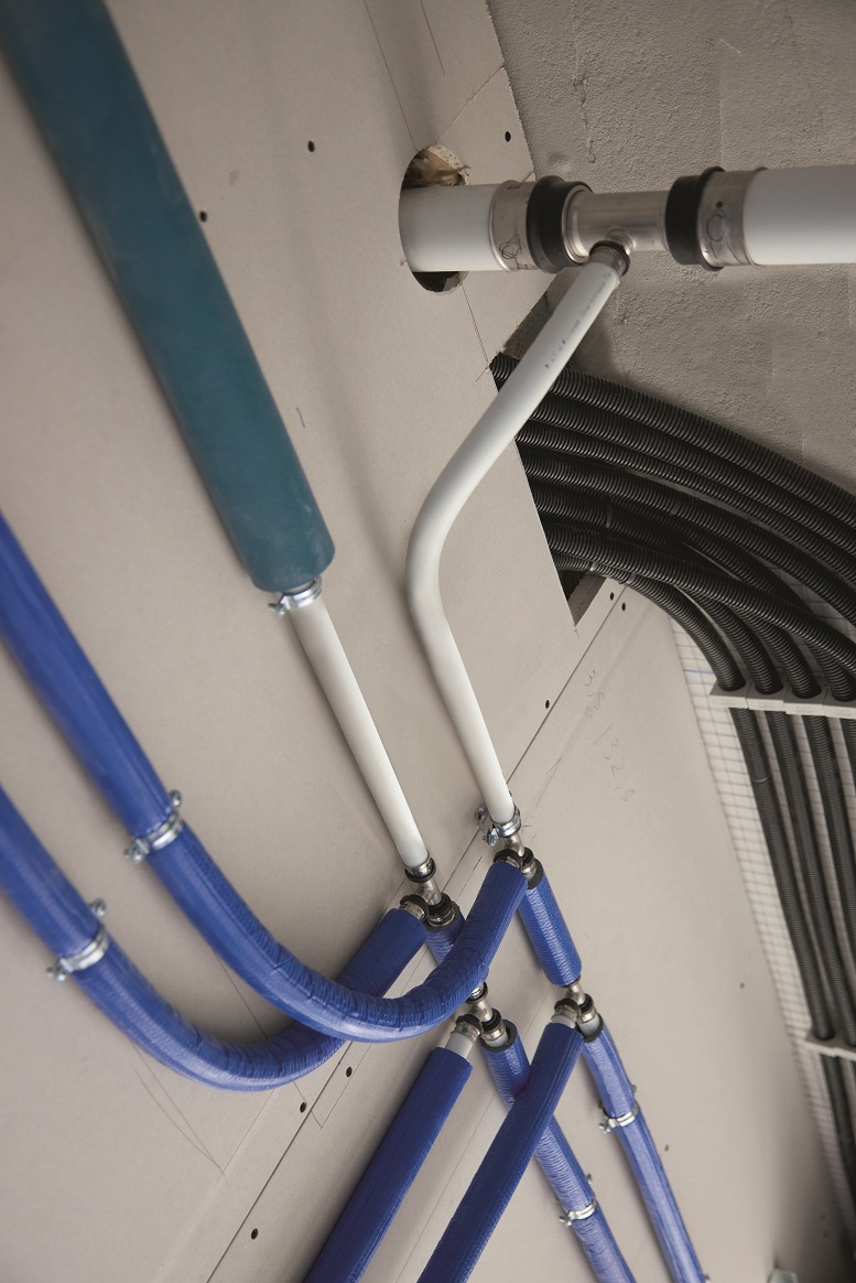 Per le reti di distribuzione dell’acqua potabile gli impiantisti hanno utilizzato Viega Smartpress sia per la distribuzione principale, sviluppata in prevalenza lungo i corridoi dell’edificio, sia per quella terminale collegata ai singoli sanitari. In questo caso provvedono alla produzione di acqua calda 2 pompe di calore, con 2 scambiatori a piastre che precedono i 2 serbatoi di accumulo posti al piano interrato. Per sezionare la distribuzione e rendere possibili le operazioni di manutenzione nelle singole camere sono state invece impiegate le valvole Viega Easytop. Un ampio set di adattatori ha facilitato le operazioni di collegamento dei tubi Smartpress a componenti con estremità come le unità termoventilanti, dotate di connessioni filettate.
