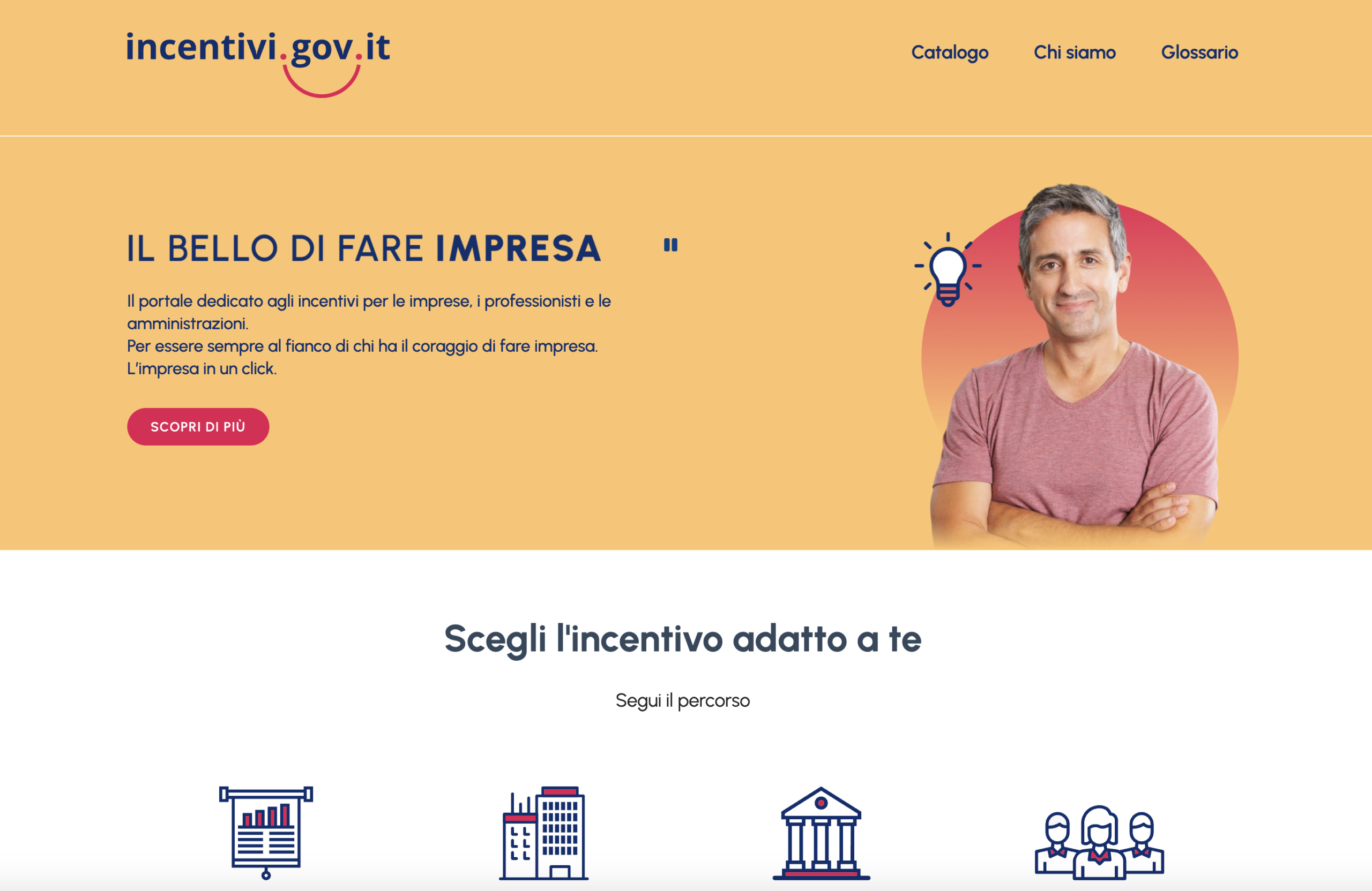 Il Ministero dello sviluppo economico ha messo a disposizione il portale incentivi.gov.it, un motore di ricerca che ha l’obiettivo di far conoscere e promuovere, in modo semplice e veloce, gli incentivi finanziati dal Ministero dello sviluppo economico, compresi quelli previsti dal Pnrr, ad aspiranti imprenditori, alle imprese nuove e a quelle già attive, ai liberi professionisti, a enti e istituzioni. Dall’home page del portale, grazie ad una dettagliata classificazione delle varie misure e a procedure guidate, si può trovare o scegliere l’incentivo seguendo uno dei quattro percorsi: