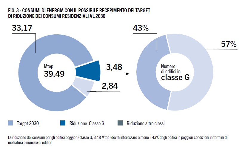 Secondo la Direttiva EPBD, che definisce i requisiti e i target da conseguire entro il 2030 per immobili residenziali e non, nuo­vi e ristrutturati, l’Italia dovrebbe ridurre il consumo di energia primaria per gli edifici a uso abitativo del 16% rispetto al 2020, quindi di 6,32 Mtep (milioni di tonnellate equivalenti di petrolio, passando da 39,49 Mtep a 33,17) e ben il 55% di questo rispar­mio (3,46 Mtep) dovrebbe riguardare gli immobili di classe G (figure 2 e 3).