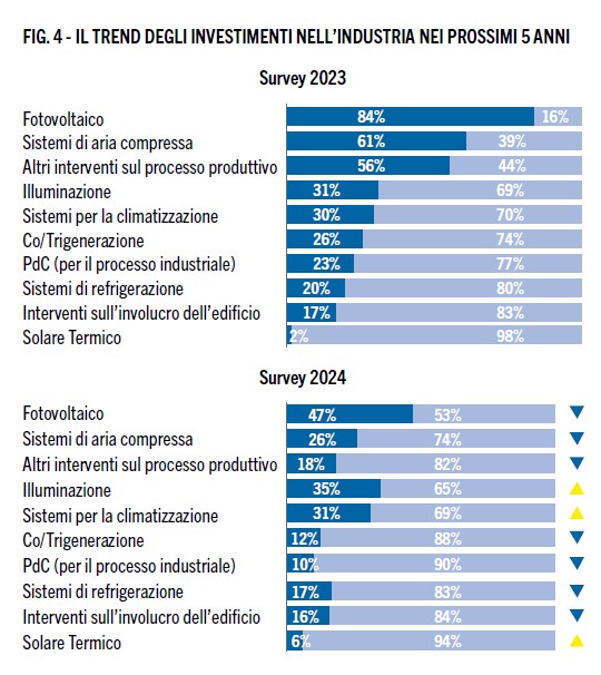 Dal Report emerge inoltre che il trend degli investimenti futuri è in calo, con un significa­tivo declino dell’interesse a investire in tecnologie come il foto­voltaico, i sistemi ad aria compressa e gli interventi sui processi produttivi per il prossimo quinquennio, prevedendo, dunque, un rallentamento degli investimenti complessivi (figura 4).