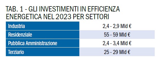 efficienza energetica Energy Efficiency Report In Italia, quasi la metà degli edifici (il 40% dello stock immobilia­re, ossia circa 5 milioni) appartengono alla classe energetica G. È dunque evidente che, con un parco immobiliare vetusto e am­piamente confinato nelle classi energetiche peggiori, lo sforzo di riqualificazione è decisamente impegnativo. Come riportato dal Report, si stima che gli investimenti in efficienza energetica in Italia nel 2023 siano stati pari a circa 85-95 miliardi di euro (tabella 1).