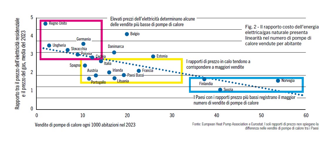 Già oggi appare evidente che laddove il costo dell’energia elettri­ca è più conveniente, le installazioni di pompe di hanno un tasso di penetrazione maggiore nel mercato (vedere figura 2).