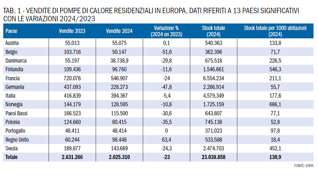 Nel 2024, in sostanza, sono state vendute solo 2 milioni di pom­pe di calore residenziali in questi 13 paesi, che costituiscono cir­ca l’85% del mercato europeo, rispetto ai 2,6 milioni venduti del 2023 (tabella 1).