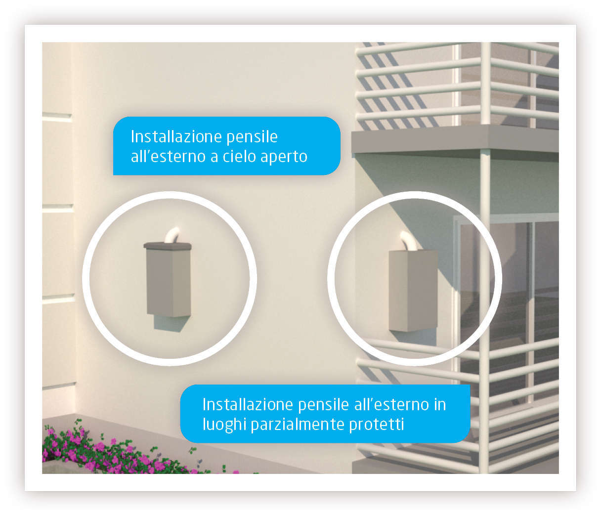 LUNA IN PLUS può essere installata pensile all’esterno in luoghi parzialmente protetti, come i balconi, e anche a cielo aperto con l’aggiunta del kit di copertura per esterno.