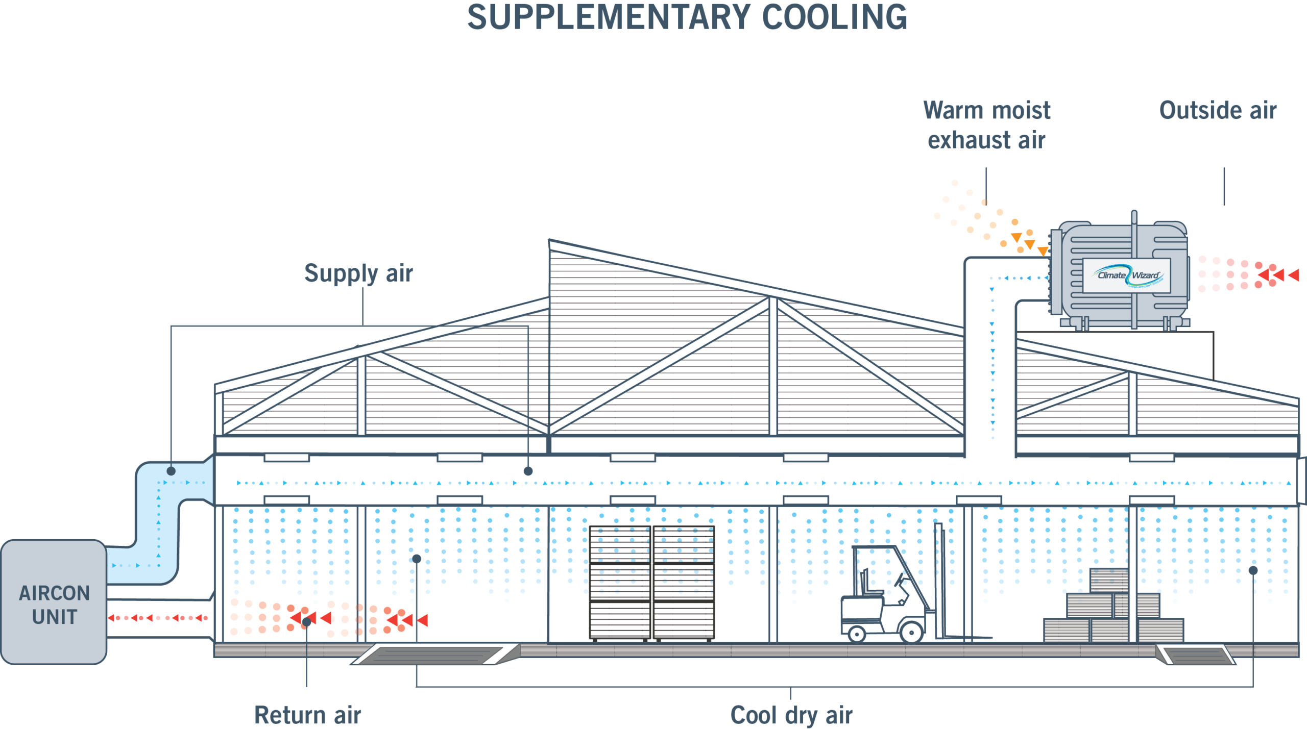Può anche essere utilizzato come raffreddamento supplementare nel caso di chiller o condizionatori tradizionali che funzionano con l’aria interna di ricircolo. In questo caso Climate Wizard introduce direttamente nell’ambiente industriale aria pre-raffreddata e pura dall’esterno, la quale verrà ulteriormente raffreddata dal condizionatore.