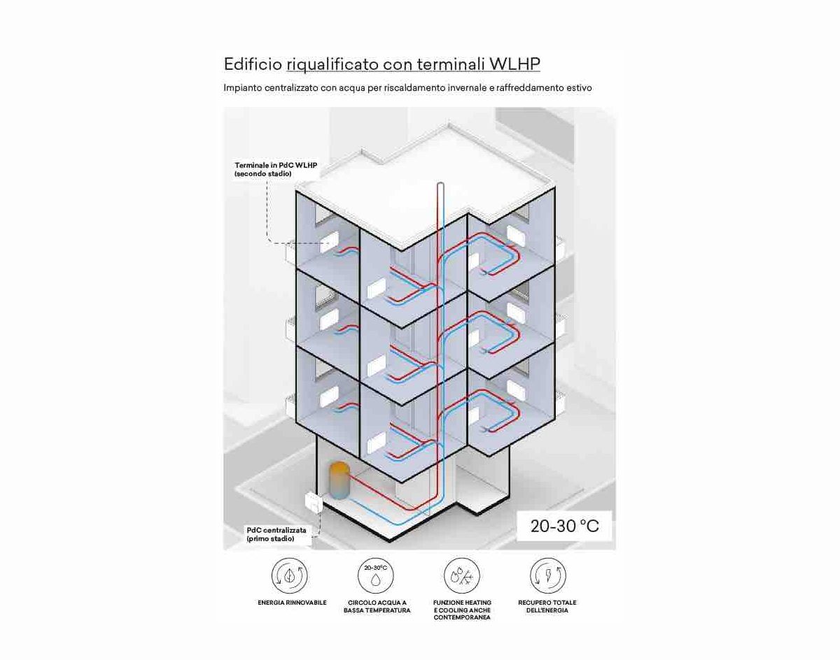 – la sostituzione dei terminali esistenti (fancoil o radiatori) nelle abitazioni con i terminali in pompa di calore WLHP (secondo stadio), molto più efficienti e compatti, che sono collegati con il primo stadio attraverso “l’anello d’acqua” a bassa temperatura, composto dalle tubazioni esistenti.
