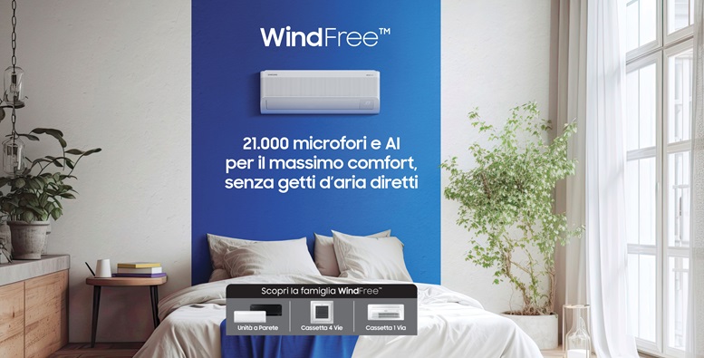 L’innovativa gamma di climatizzatori Samsung si rinnova con i nuovi modelli WindFree S2, dotati dell’esclusiva tecnologia brevettata WindFree™. Grazie a migliaia di microfori presenti sulla superficie dei climatizzatori WindFree, l’aria viene distribuita uniformemente e delicatamente, eliminando fastidiosi getti diretti e garantendo il massimo comfort, con una velocità dell’aria in uscita inferiore a 0,15 m/s, definita da Ashrae come “aria ferma”.