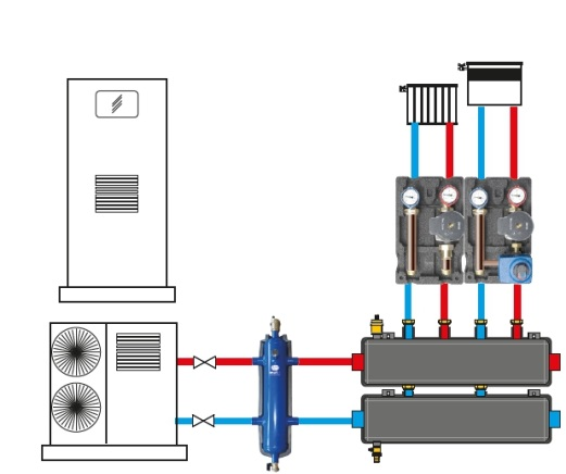 Una rappresentazione di impianto tipo collettore DADA con separatore idraulico prima del collettore: