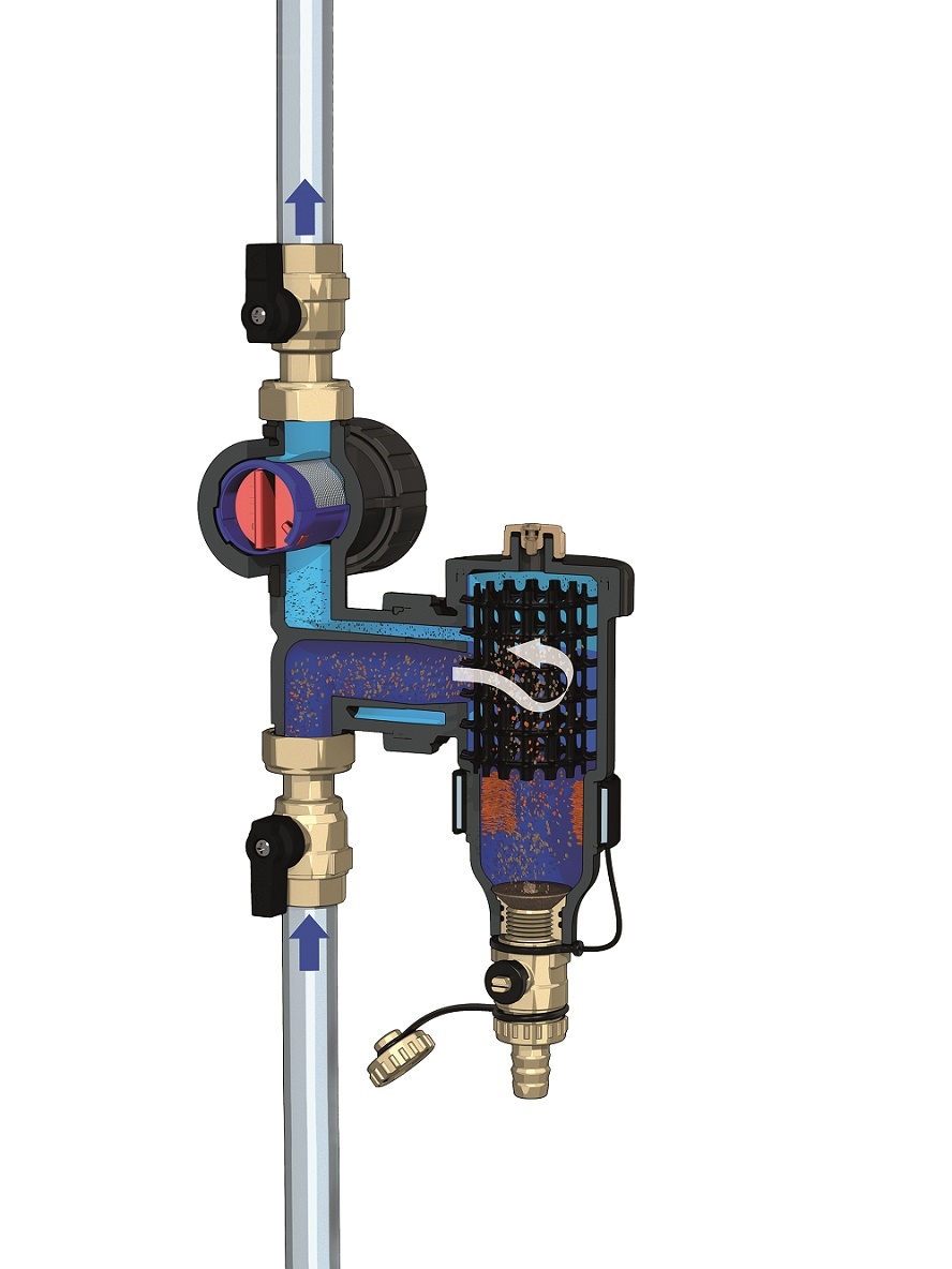 Il defangatore posizionato prima del filtro garantisce basse perdite di carico al dispositivo e lo rende adatto ad ogni tipo di impianto a circuito chiuso.