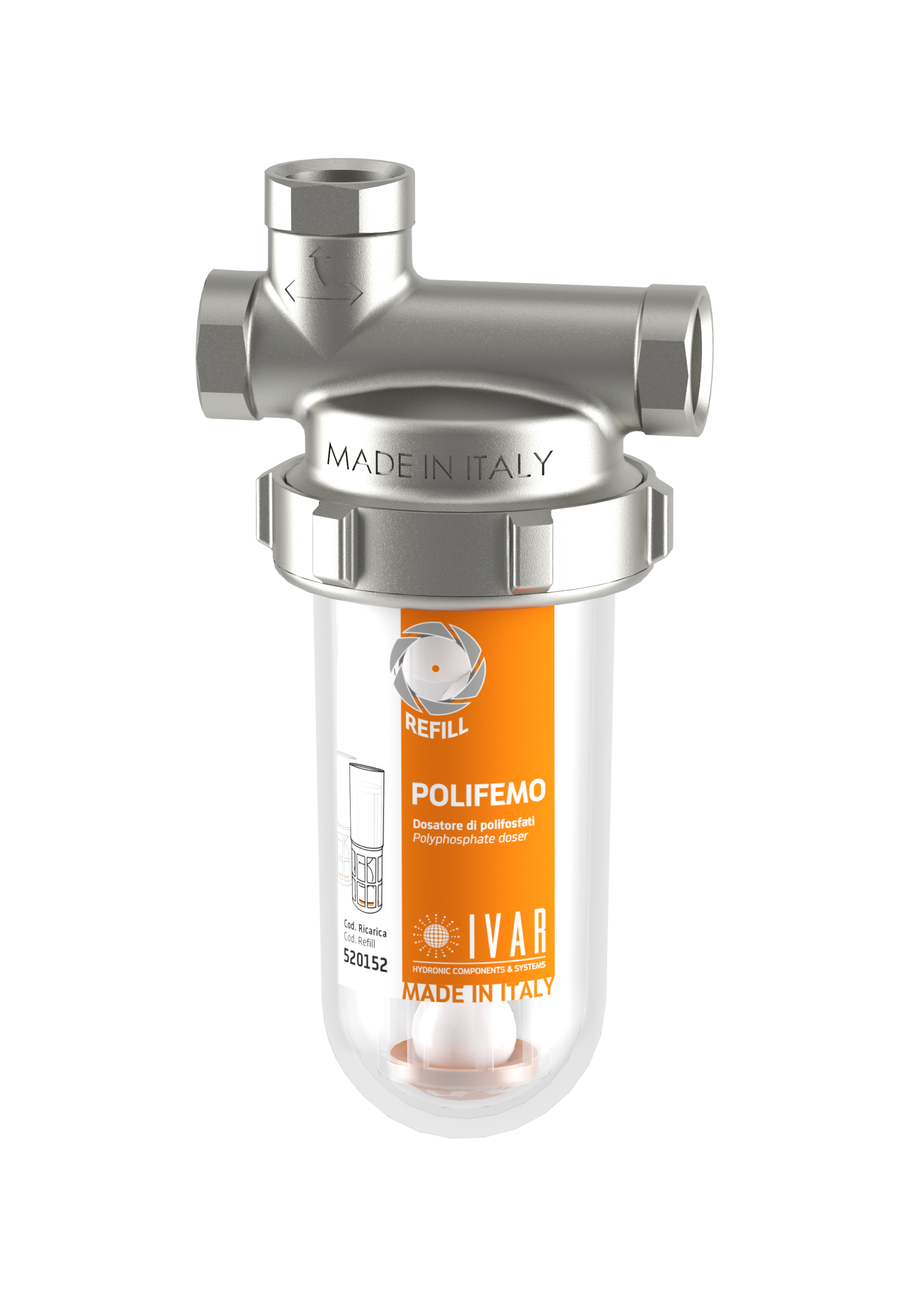 Il dosatore di polifosfati Polifemo è il nuovo prodotto per il trattamento delle acque, realizzato da Ivar (Prevalle, BS), progettato per essere installato sulle tubature che portano l’acqua nella caldaia o in altre apparecchiature quali lavatrici e lavastoviglie, al fine di ridurre la presenza di calcare.