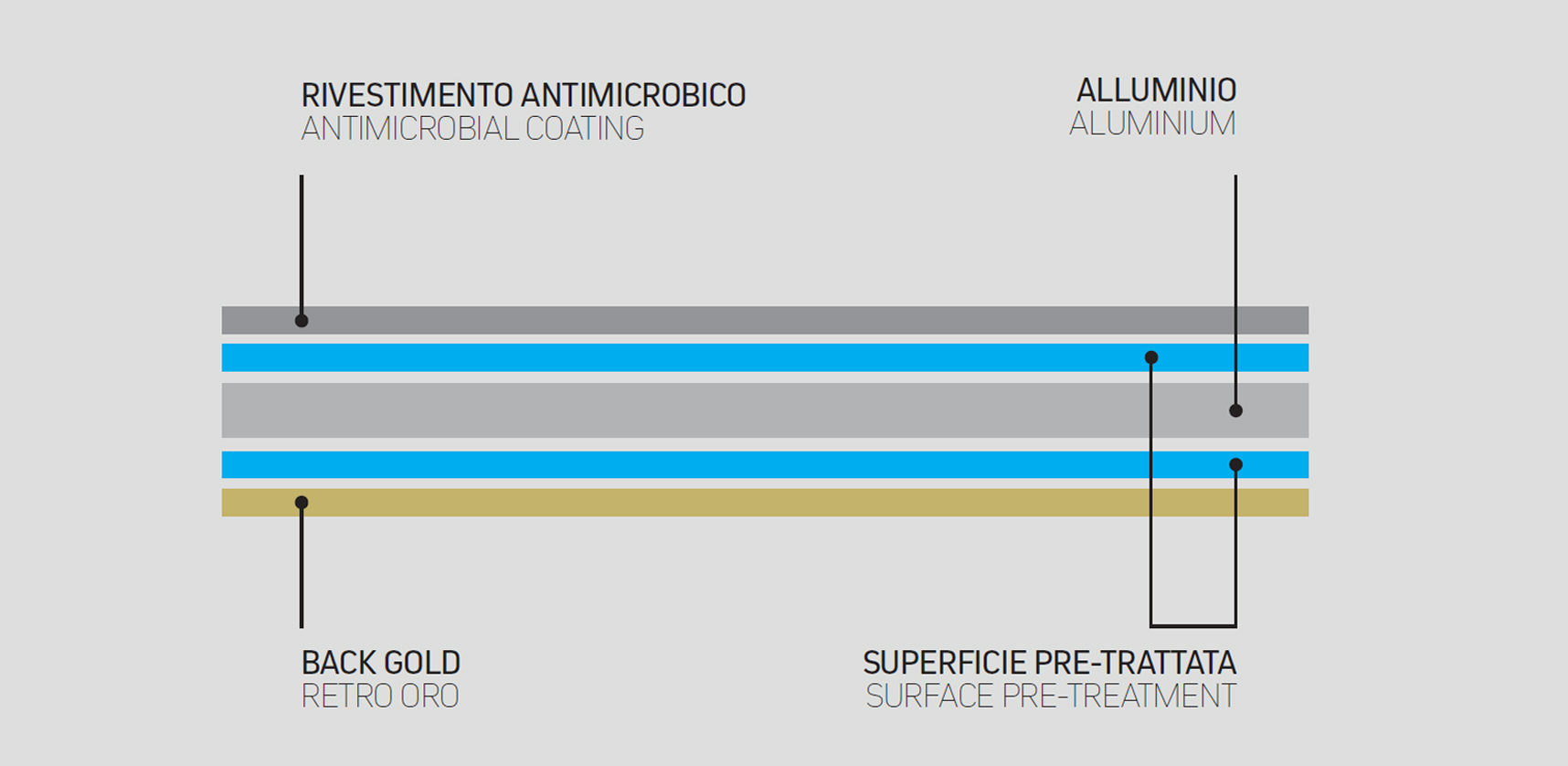 • Alluminio CARE: laccato con rivestimento antimicrobico su un lato e finitura “gold back” sull’altro, ottimizza l’adesione alle schiume polyiso e innalza gli standard di igiene.