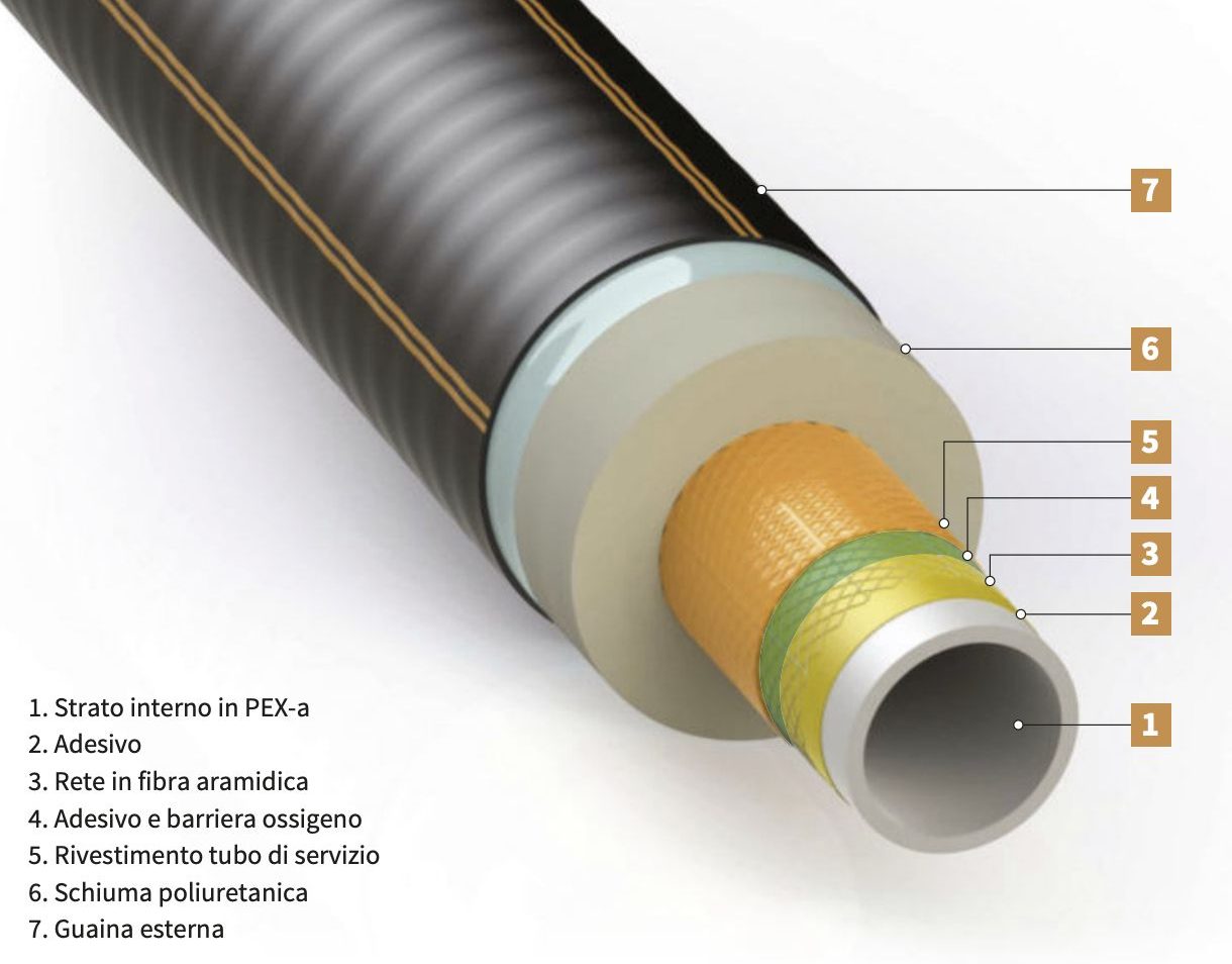 Il tubo di servizio ha una struttura composta da uno strato interno di polietilene reticolato PEX-a, un rinforzo in fibra aramidica ad alto modulo elastico, una barriera ossigeno e interposti strati di adesivo termoplastico per alte temperature tesi a legare ogni elemento in una struttura composita coerente.