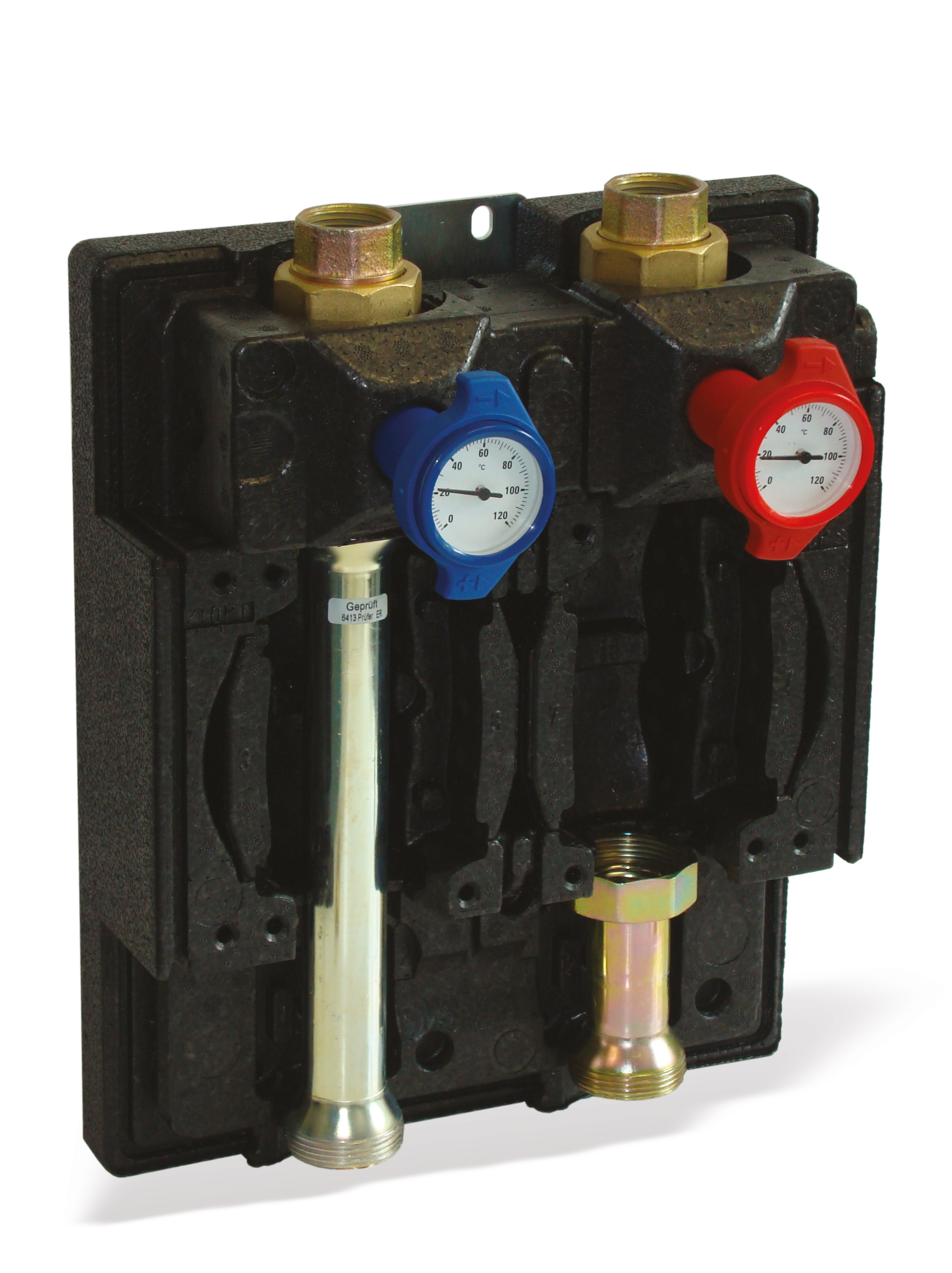 La temperatura di andata e ritorno del fluido nel circuito secondario è leggibile sui termometri integrati nelle valvole di intercettazione ed è visibile anche con la coibentazione montata. La valvola di intercettazione della mandata è dotata di sistema gravity flow stop che impedisce la circolazione naturale a pompa ferma.