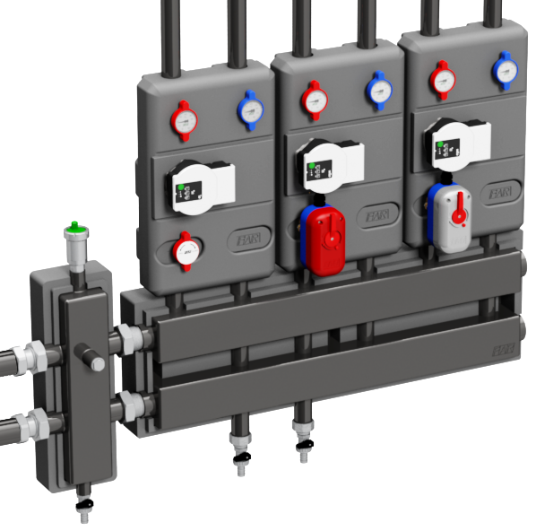 I gruppi di rilancio art. 2187-2188-2189 di FAR Rubinetterie (Gozzano, NO) sono idonei all’utilizzo per la distribuzione e la regolazione del fluido termovettore in impianti di riscaldamento e raffrescamento multi-zona. In genere vengono installati in centrale termica sui collettori di distribuzione art. 2191.