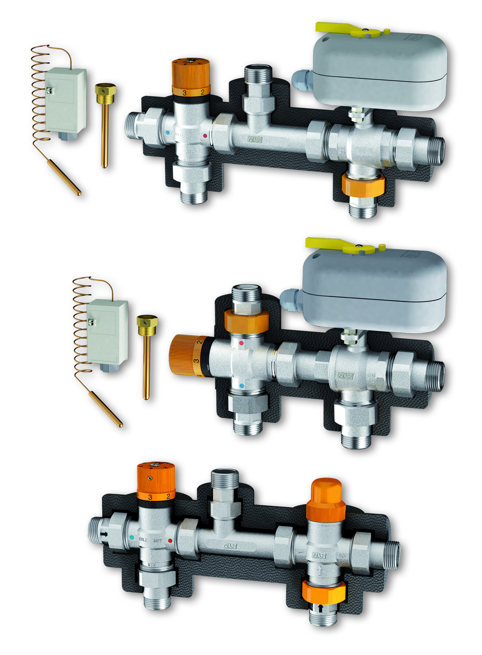 I gruppi solari di Far Rubinetterie (Gozzano, NO) (sono realizzati per l’accoppiamento di impianti a pannelli solari termici con caldaie tradizionali o istantanee, consentendo di gestire lo scambio tra le diverse fonti di calore. Sono presenti tre versioni: una per impianti senza recupero di calore e due per impianti con recupero.
