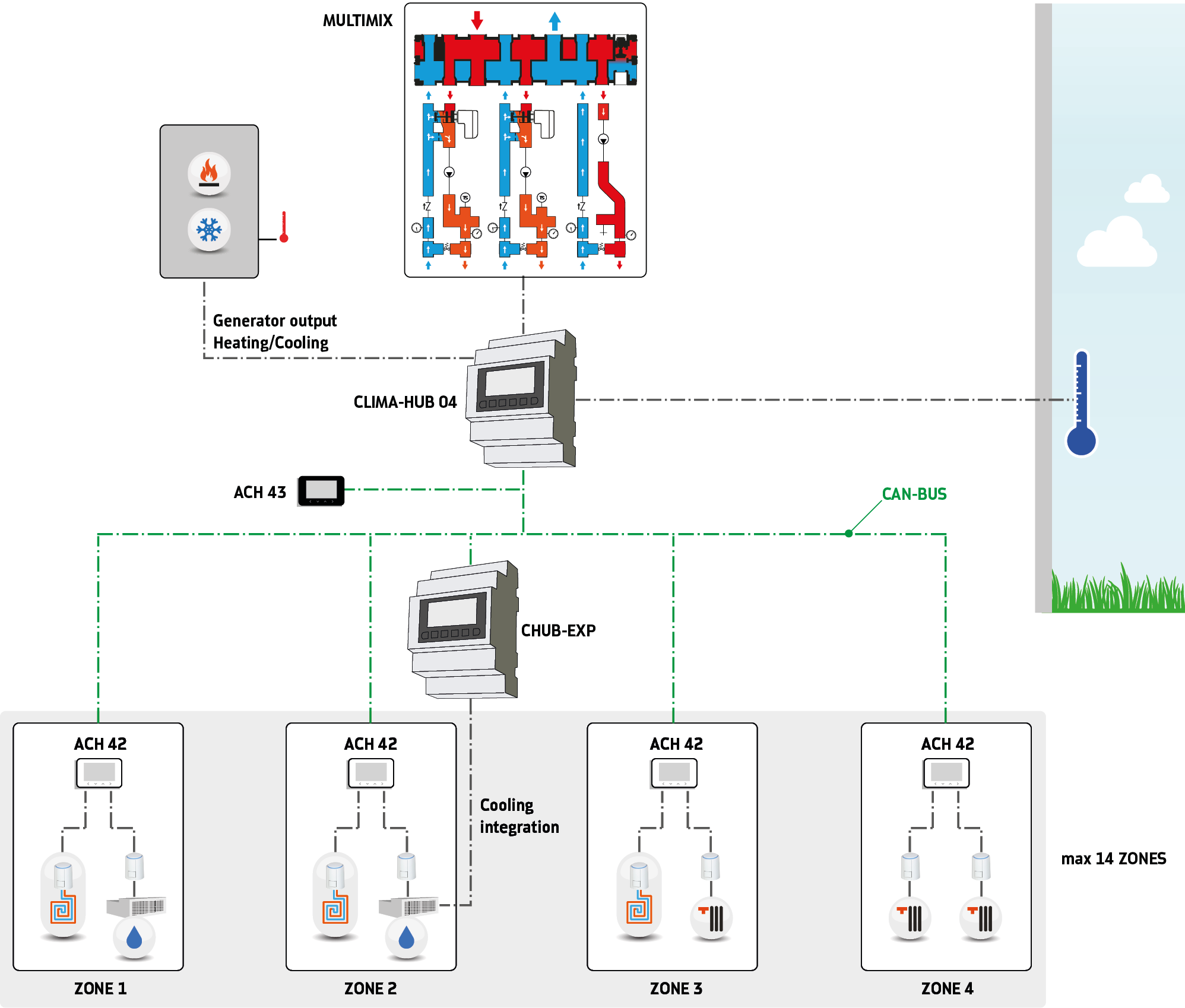 CLIMA-HUB 04 permette la gestione di 2 circuiti miscelati per la distribuzione all’impianto radiante con compensazione climatica e un circuito diretto per la distribuzione in alta temperatura o alimentazione dei circuiti di deumidifica. Il regolatore si interfaccia con apposite sonde di temperatura e umidità collegate via CAN-BUS. Ciascuna sonda presenta due relè attraverso i quali è possibile gestire sia l’attuatore elettrotermico di zona sul collettore sia l’eventuale deumidificatore dedicato. È disponibile opzionalmente un visore touchscreen a colori per il monitoraggio dell’impianto da un unico terminale dell’abitazione. Inserendo il modulo di espansione CHUB-EXP è possibile fornire un ulteriore consenso alle macchine di deumidificazione qualora queste possano lavorare anche in modalità integrazione raffrescamento; è possibile, infatti, azionare un booster di integrazione qualora il setpoint di temperatura non venga raggiunto entro un certo intervallo di tempo impostabile dall’utente.