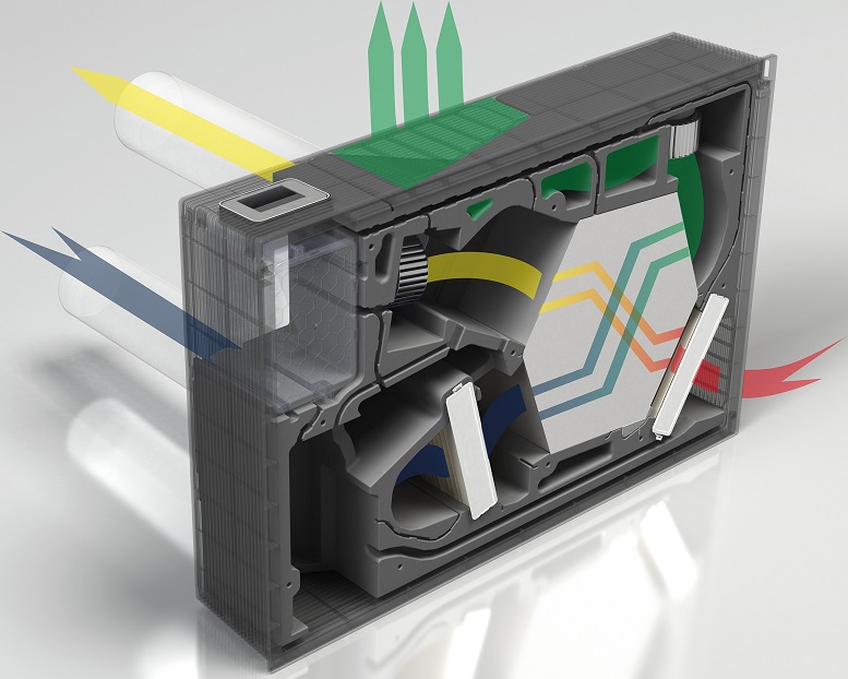 I filtri ISO ePM1 e ISO Coarse garantiscono la qualità dell’aria (bloccando polveri, smog, allergeni, virus e batteri, ma anche anidride carbonica e umidità) mentre lo scambiatore di calore a flussi incrociati riduce i consumi energetici, recuperando oltre il 90% dell’energia termica.