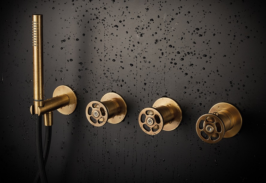 Qualità costruttiva e piacevolezza estetica si incontrano nei miscelatori termostatici OMBG (Bolzano Novarese, NO), assecondando il crescente bisogno di personalizzazione richiesto dalla clientela contemporanea. Un elemento del miscelatore che si presta particolarmente ad assumere differenti forme è la maniglia, che nella serie Industrial si ispira agli ingranaggi dei macchinari industriali.