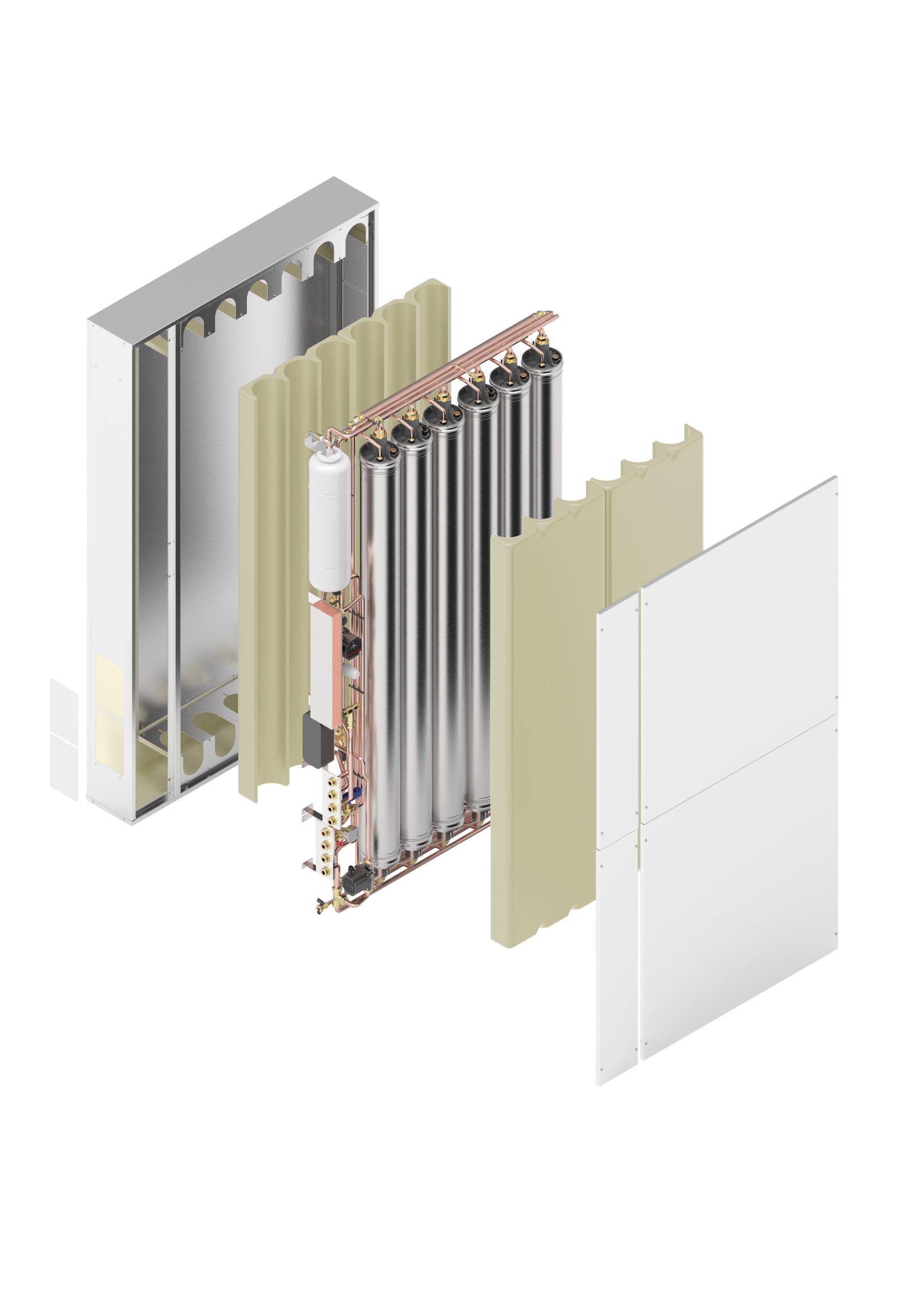 Il sistema, presentato da AR-THERM (Montecchio Maggiore, VI), è realizzato da una serie di serbatoi cilindrici in acciaio inox di piccolo diametro posizionati verticalmente e collegati tra loro attraverso un complesso sistema di collettori che permette un equilibrato caricamento ed eccezionale prelievo dell’energia. Il sistema è perfettamente isolato per dare il massimo dell’efficienza energetica. L’isolante riveste sia le componenti idrauliche che il sistema di accumulo.
