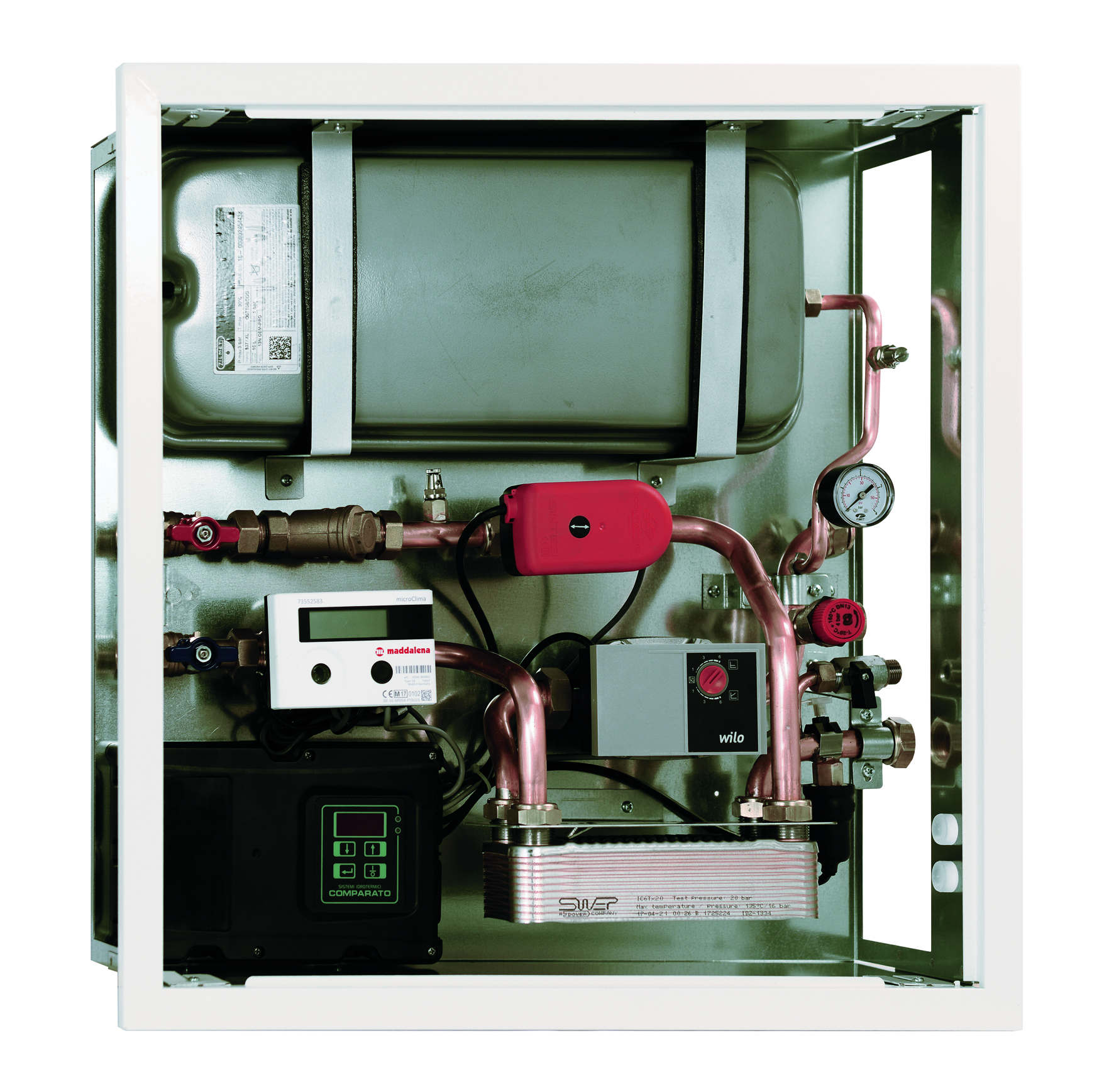 Conter R è disponibile con installazione ad incasso, in sostituzione dei radiatori, con o senza collettore di distribuzione. Entrambe le soluzioni includono filtro, vaso di espansione, manometro, valvola di sicurezza, valvola per il carico manuale, circolatore e termostato di sicurezza.