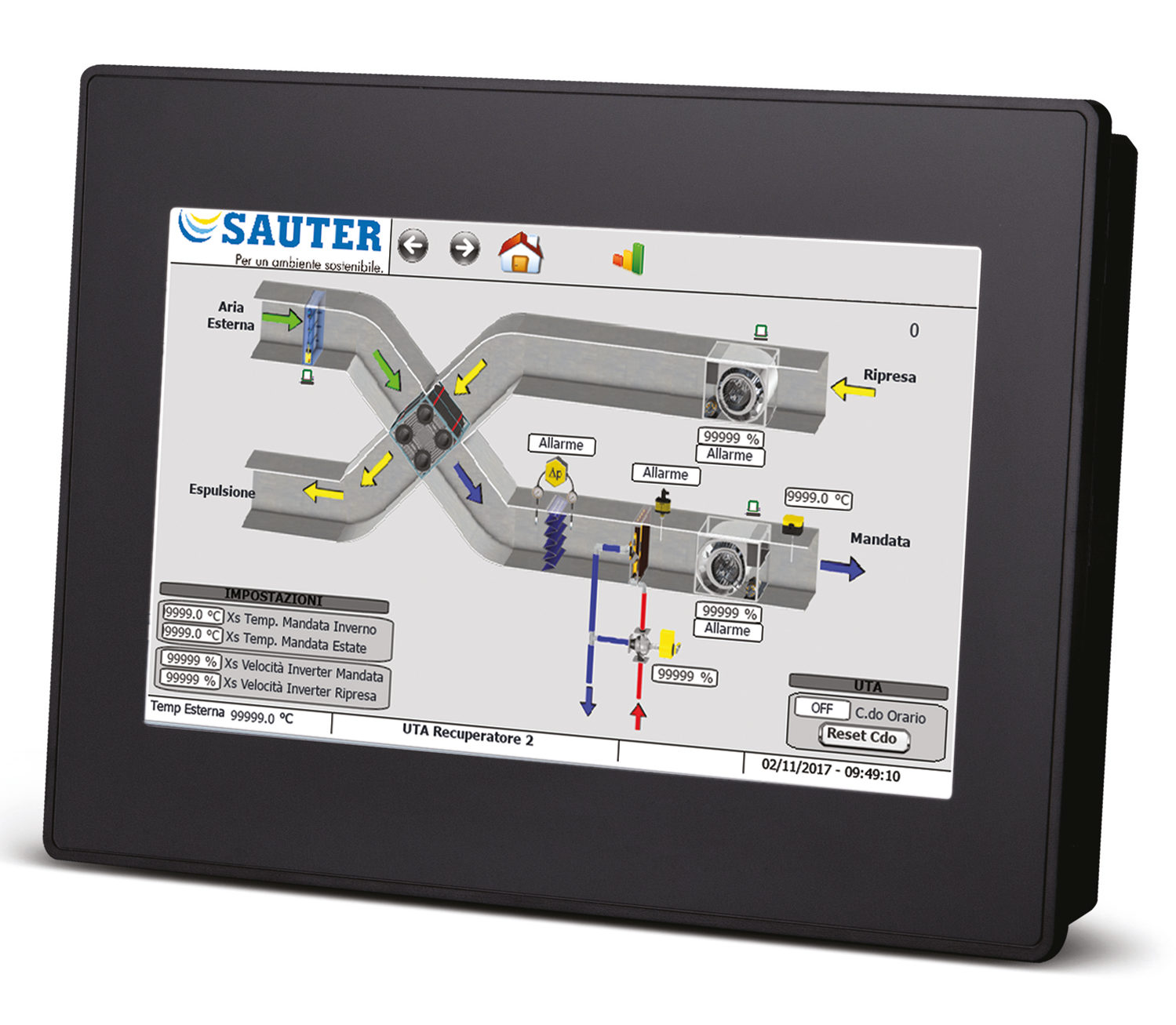 I nuovi touch-panel Sauter EY-OP850 sono la soluzione più efficiente e prestazionale per monitorare e gestire tutti i tipi di impianto, rappresentati su pagine grafiche completamente personalizzabili. La verifica degli allarmi, la modifica delle schedule e l’invio di comandi a tutti i dispositivi connessi tramite protocolli BACnet MS/TP ed IP, Modbus e KNX è ora realmente semplice ed alla portata di tutti. Tali protocolli possono essere contemporaneamente attivati per un costante scambio di dati con formule e operatori logici già disponibili. Inoltre, il web-server integrato permette la visualizzazione e il controllo del pannello anche da remoto, con la possibilità di definire diversi livelli di accesso per limitare le operazioni effettuabili a seconda del profilo dell’utiIizzatore.