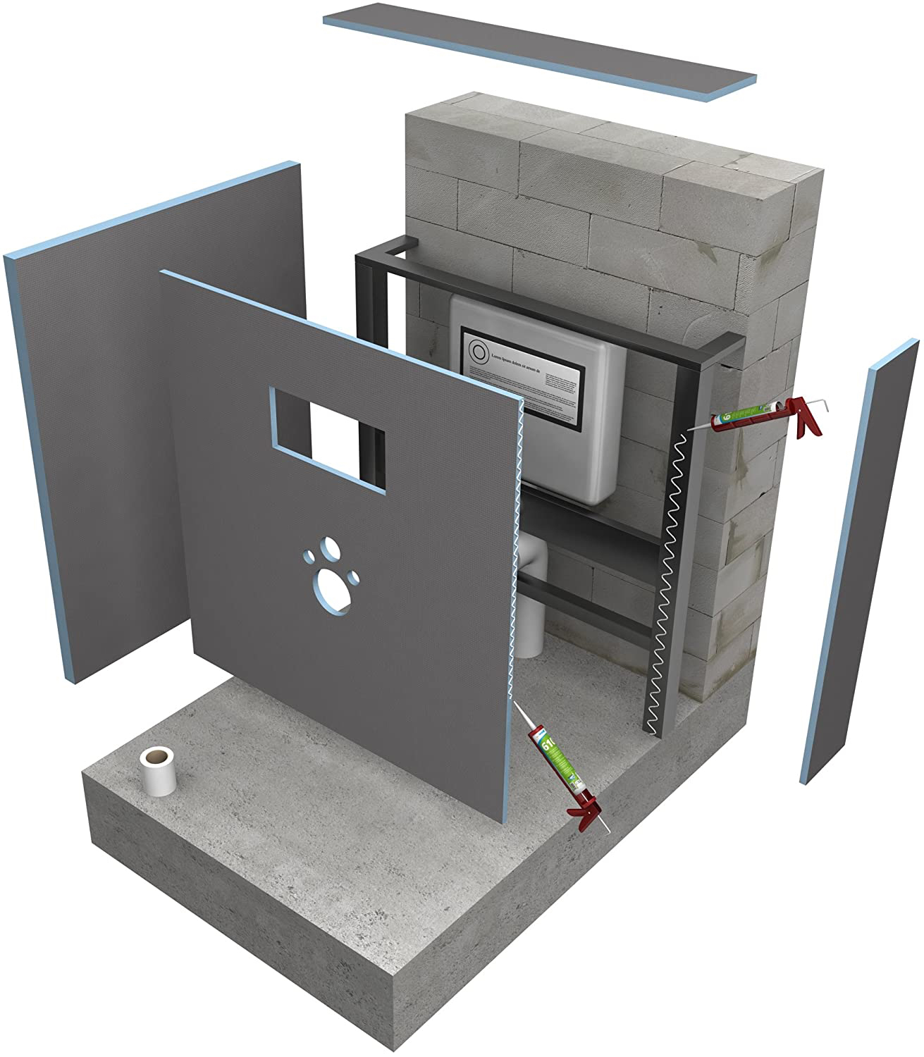 Lo stesso idraulico che posa il modulo di installazione per wc può facilmente rivestirlo con questi speciali pannelli in polistirene estruso già predisposti per aperture universali in corrispondenza di tubature e staffe di fissaggio.