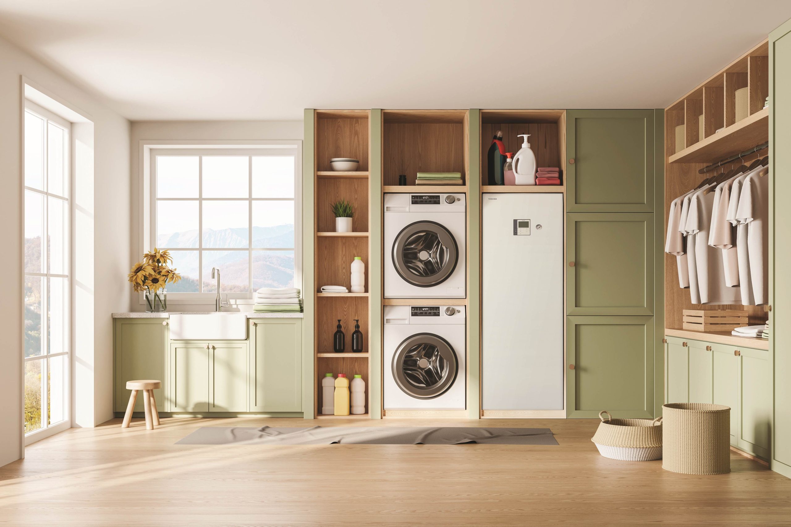 Presentando un ingombro ridotto di appena di 595×670 mm è costruita per integrarsi perfettamente a scomparsa in ambienti domestici come cucine, bagni, lavanderie. All-in-One è di rapida installazione e messa in servizio e può essere collegata ad impianti a pavimento, o a ventilconvettori a parete, a pavimento, soffitto a incasso e può essere abbinata a sistemi fotovoltaici.