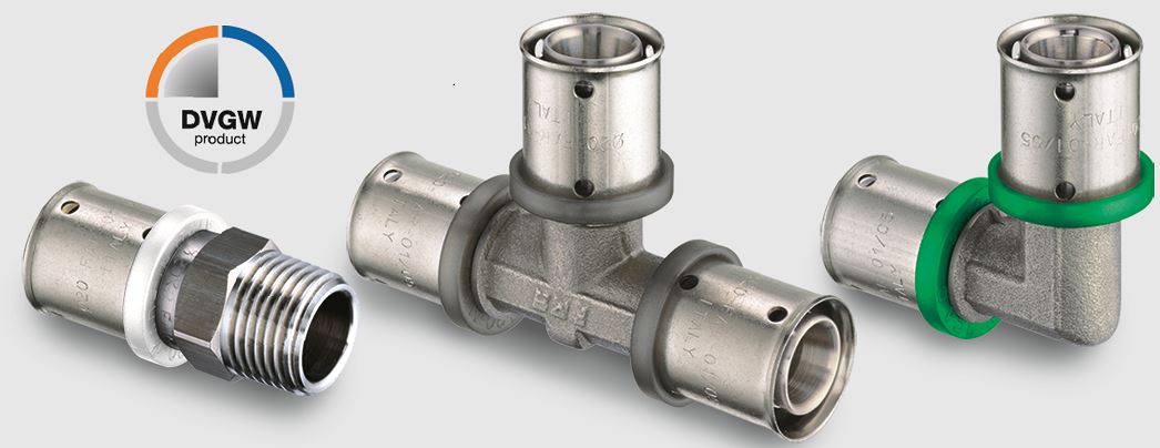 Il raccordo è realizzato in ottone con un profilo sagomato su cui sono inserite particolari guarnizioni a sezione rettangolare in EPDM. La bussola esterna è in acciaio inox, è reversibile ed è dotata di fori di controllo per verificare il corretto inserimento del tubo.