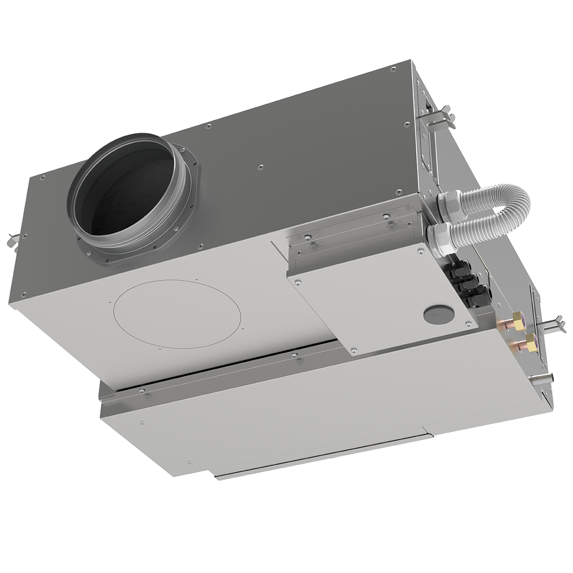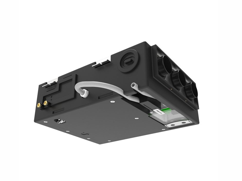 Il nuovo DWF 250 è un modulo di deumidificazione, isotermico e canalizzabile, progettato per l’abbinamento in controsoffitto a un’unità di ventilazione meccanica controllata con adeguata portata d’aria. È costituito da un’unità frigorifera completa e batterie di pre e post trattamento da alimentare con acqua refrigerata (15°). Presenta degli attacchi per l’ingresso dell’aria in linea o dal basso Ø 160 mm e offre la possibilità di collegamento dell’uscita dell’aria direttamente al sistema distribuzione PLD o al tubo Ø 160 mm. Il quadro elettrico è visibile dal basso e rimovibile, per facilitare le operazioni di manutenzione.