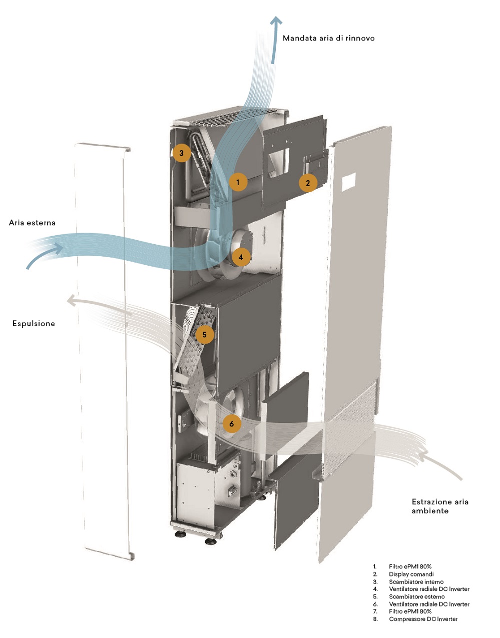 Recuperatore termodinamicoIl recuperatore termodinamico 2.0 RINNOVA, contribuisce al miglioramento del comfort attraverso l’immissione di aria esterna di rinnovo che viene immessa, purificandola con filtri di efficienza ePM1 80%, a temperature ideali per il confort. L’aria ambiente viene costantemente monitorata attraverso i sensori di temperatura, umidità, CO2 e VOC, agendo automaticamente sulla quantità d’aria di rinnovo in funzione delle condizioni interne.