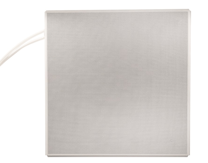 Disponibile in dimensioni 600×600 mm e 600×1200 mm, il nuovo elemento a soffitto è composto da pannelli in gesso rivestito rinforzato in fibra di legno da 15 mm, con circuito radiante pre-installato internamente, e da uno strato posteriore di isolamento EPS 035 DEO di pari spessore. La parte a vista è invece rivestita da una lamiera metallica microforata in acciaio ribassata di 8 mm rispetto alla sottostruttura, che contribuisce a creare soffitti dal design lineare, ideali nell’ambiente ufficio, nei centri commerciali, negli alberghi e negli aeroporti.