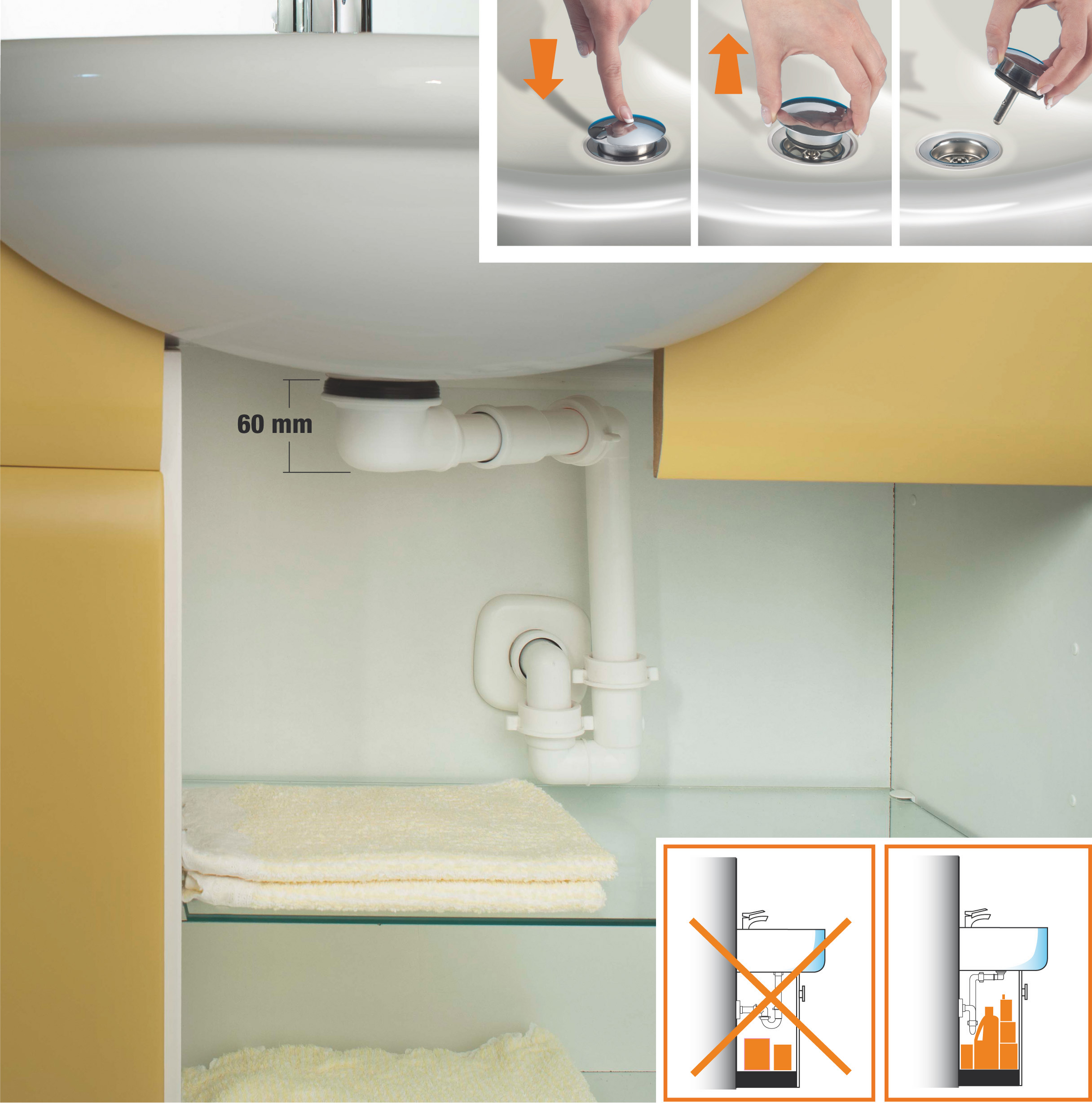 L’abbinamento del Sifone Spazio Bagno, dotato di un’agevole struttura con tubazioni aderenti alla parete di fondo, alla Piletta Bagno Bassa dalla ridotta altezza di soli 60 mm, permette di utilizzare la zona sottolavabo come vano in cui poter riporre, in modo ordinato, detersivi, asciugamani, ecc.