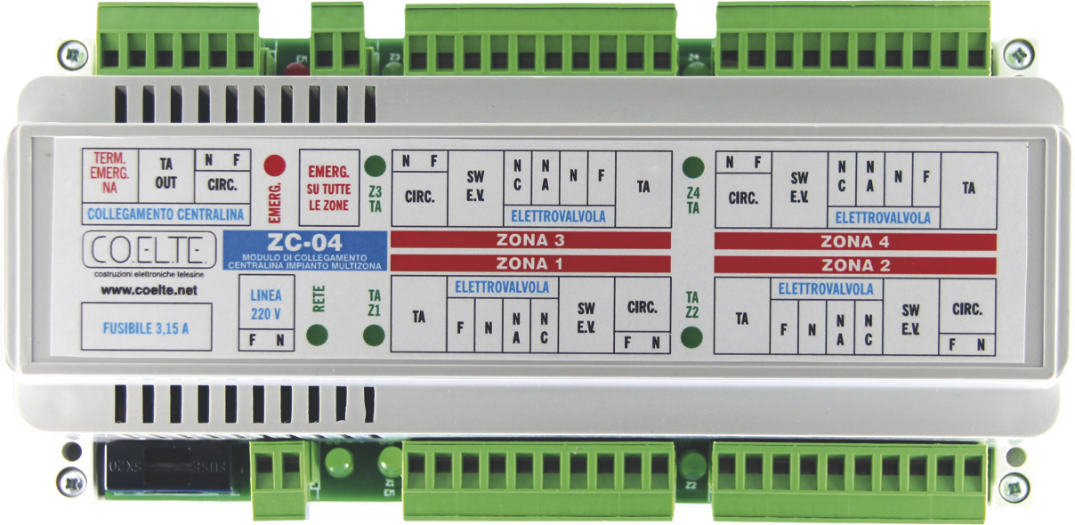 La nuova apparecchiatura elettronica di Coelte (Dugenta, BN) si chiama ZC-04 ed è stata realizzata per agevolare l’istallatore nella realizzazione di più impianti di riscaldamento separati ma alimentati dallo stesso generatore (caldaia, termocamino, ecc..). La centralina elettronica ZC-04 consente di collegare in maniera rapida ed intuitiva fino a 4 zone di riscaldamento. I dispositivi di controllo di ogni singola zona vanno semplicemente collegati alla rispettiva morsettiera di zona.