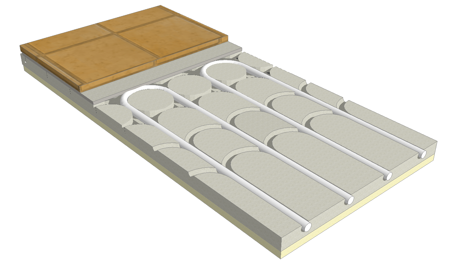 Il sistema ha uno spessore di soli 2 cm e può essere installato direttamente sul pavimento pre-esistente senza lavori di demolizione oppure su sottofondi isolati in abitazioni a basso consumo. La finitura del pavimento può essere in legno, ceramica, marmo o linoleum.