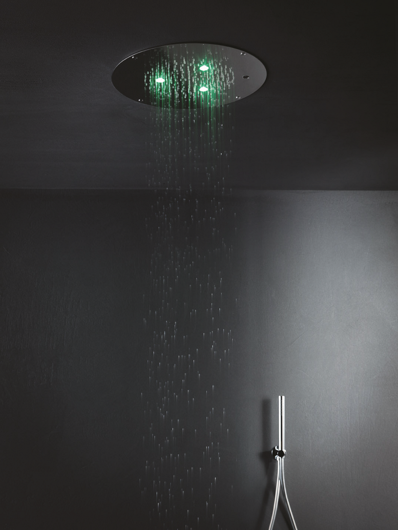 Gattoni Rubinetteria propone soffioni a incasso e a contro-soffitto, dotati di getto di erogazione e di luci led per la cromoterapia, capaci di trasformare il flusso d’acqua in un fascio rinvigorente di luminosità e colore.