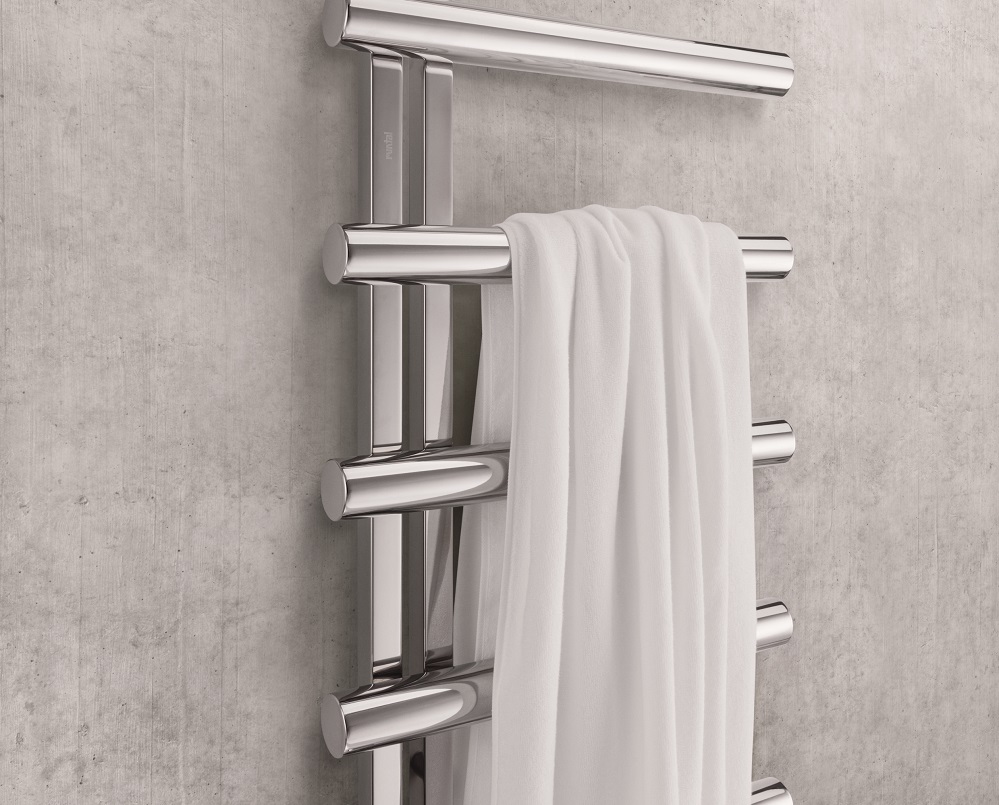 Con i suoi tubi tondi, potenti ed essenziali al contempo, Runtal Chime diffonde calore gradevole e cattura lo sguardo nella stanza da bagno. L’apertura sul lato e gli ampi spazi tra i tubi offrono anche massimo comfort, permettendo di inserire lateralmente e appendere agevolmente il telo da bagno con una sola mano. La resistente superficie in acciaio inox pregiato e la forma ergonomica del radiatore consentono una pulizia semplice e rapida, assicurando la massima igiene.